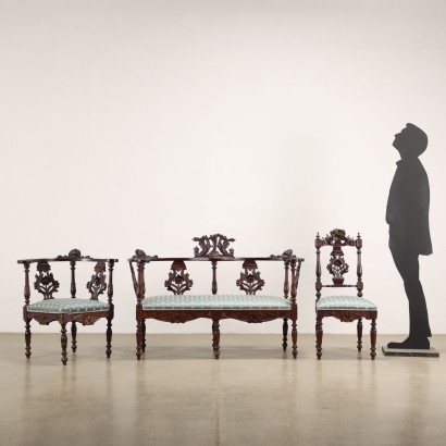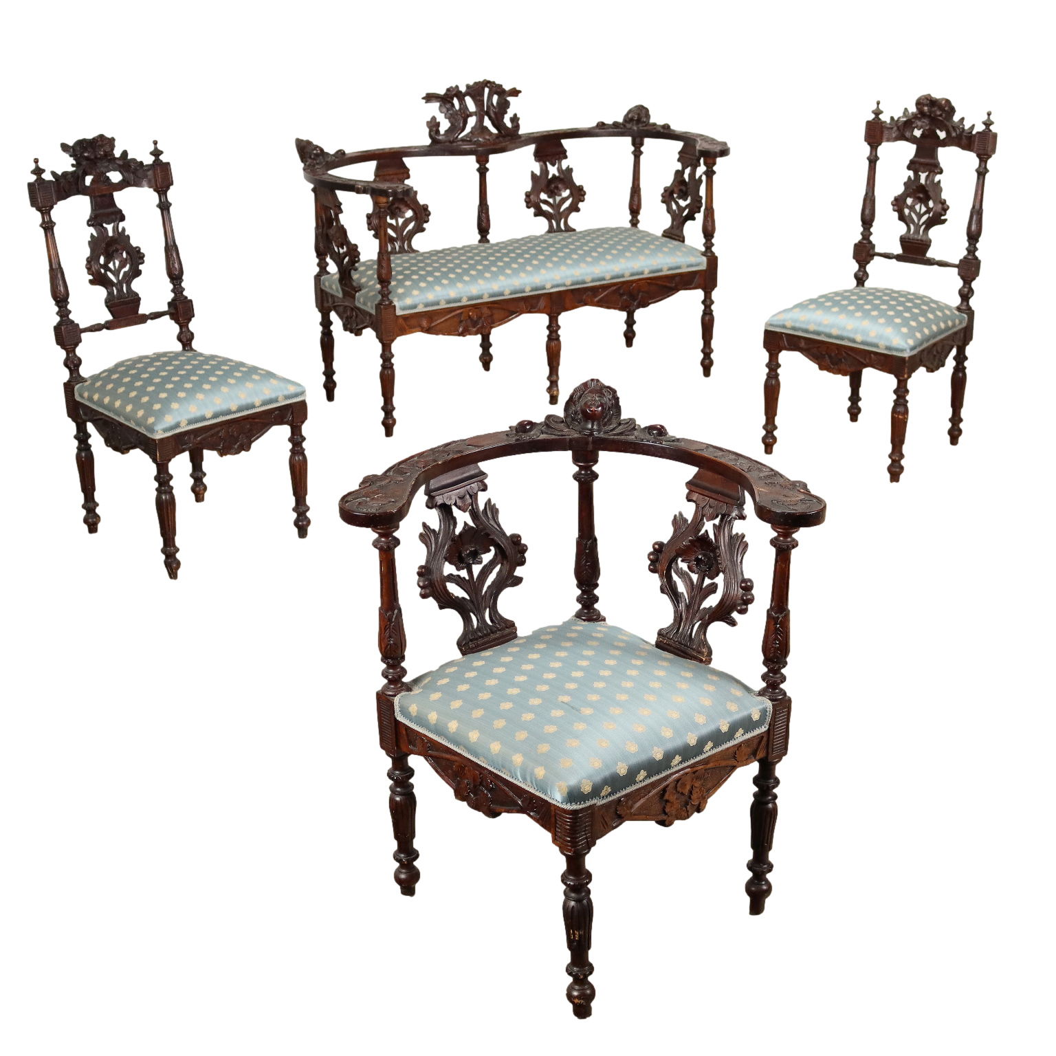Salottino in stile eclettico in legno di tiglio intagliato, Italia inizio XX secolo. Composto da divanetto, coppia di sedie e poltrona angolare. Decorato con motivi di gusto classico tra cui grifoni ed elementi fogliacei; completano l'ornamento volti di putti intagliati. Sedute imbottite.