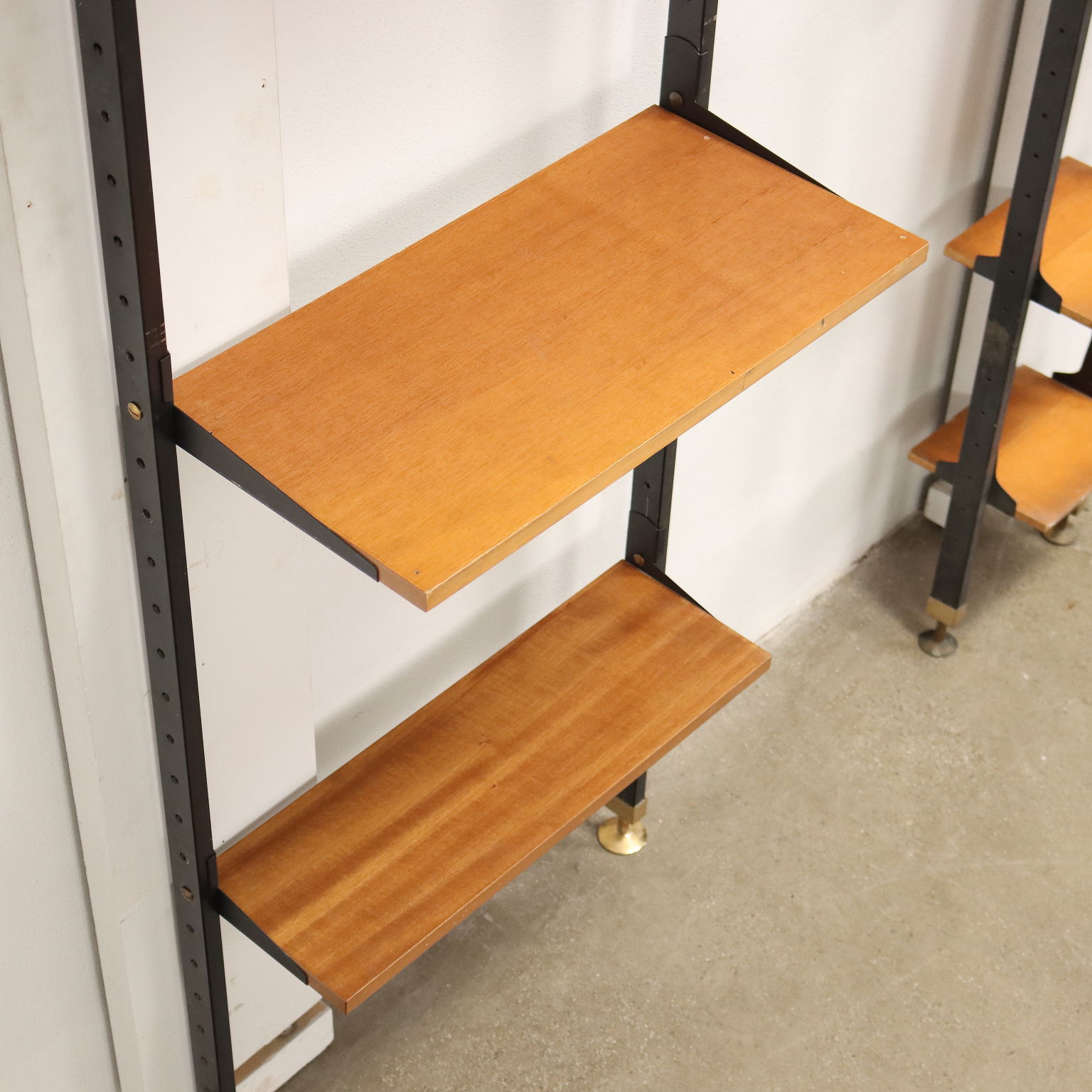 Descrizione Gruppo di 3 librerie non uguali, con ripiani a posizione regolabile; legno impiallacciato, montanti in metallo smaltato, terminali in ottone.