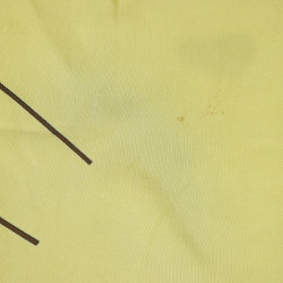 Foulard in pura seta firmato Roberto Capucci. Le condizioni sono buone, a parte lievi macchie che non ne precludono l'utilizzo. Lo sfondo giallo lime è incorniciato in marrone; al centro troviamo la stampa di quattro cavalieri orientali. Roberto Capucci è considerato e riconosciuto a livello internazionale come uno dei più grandi designer del XX secolo, e è risaputa la sua passione per il mondo orientale.