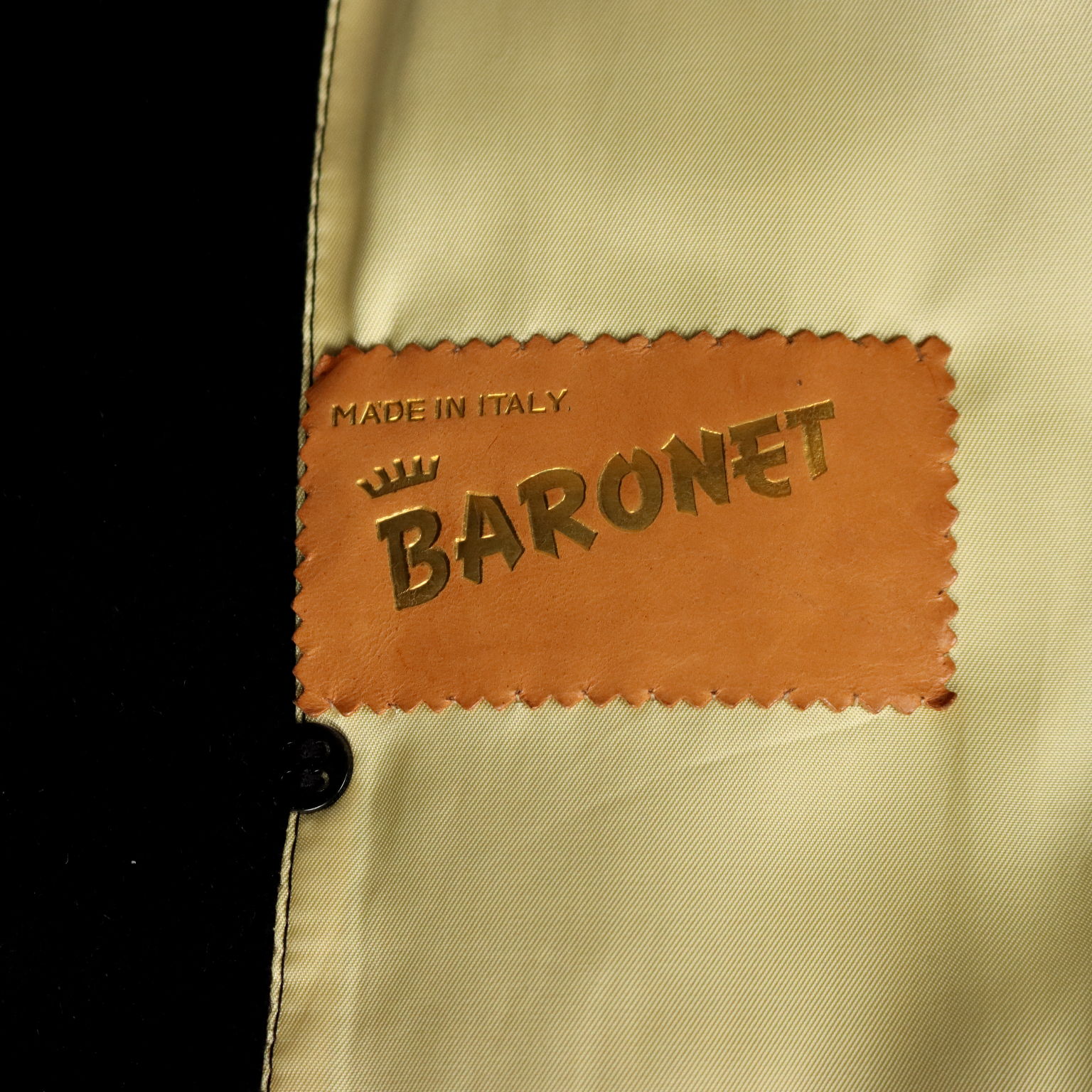 Cappotto nero da uomo, in puro Cashmere, realizzato da Baronet. Allacciatura a doppio petto, tre bottoncini ai polsi, tasche a pattina in vita e spacco posteriore. Non ha più l'etichetta della taglia, ma veste una 48. Lunghezza cm. 103; spalle cm. 48; maniche cm. 62. Condizioni molto buone.