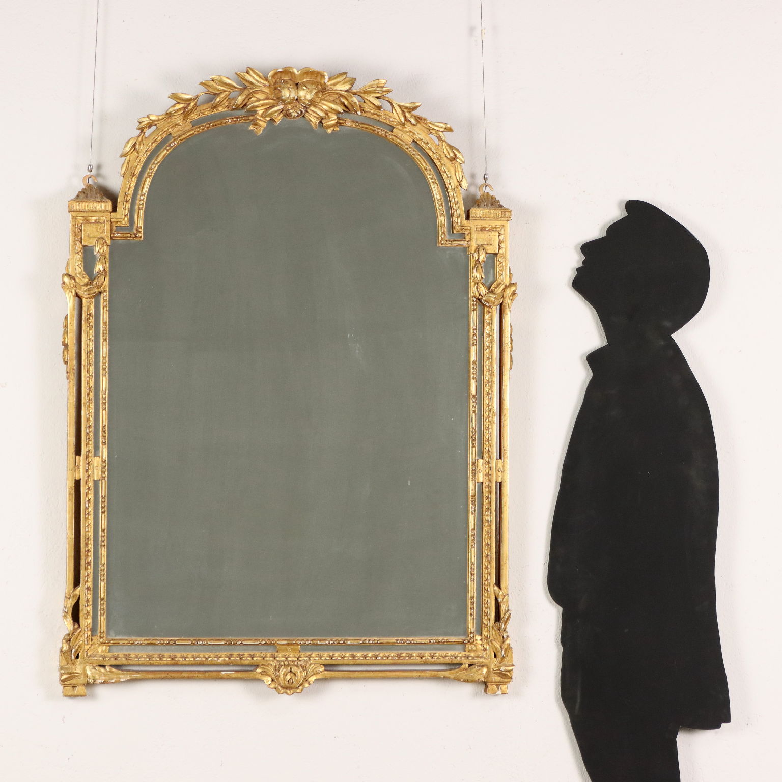 Specchiera sagomata con cornice in legno intagliato e dorato, cimasa con motivi floreali e greche ornamentali su tutto il corpo della cornice. Italia seconda metà XIX secolo.