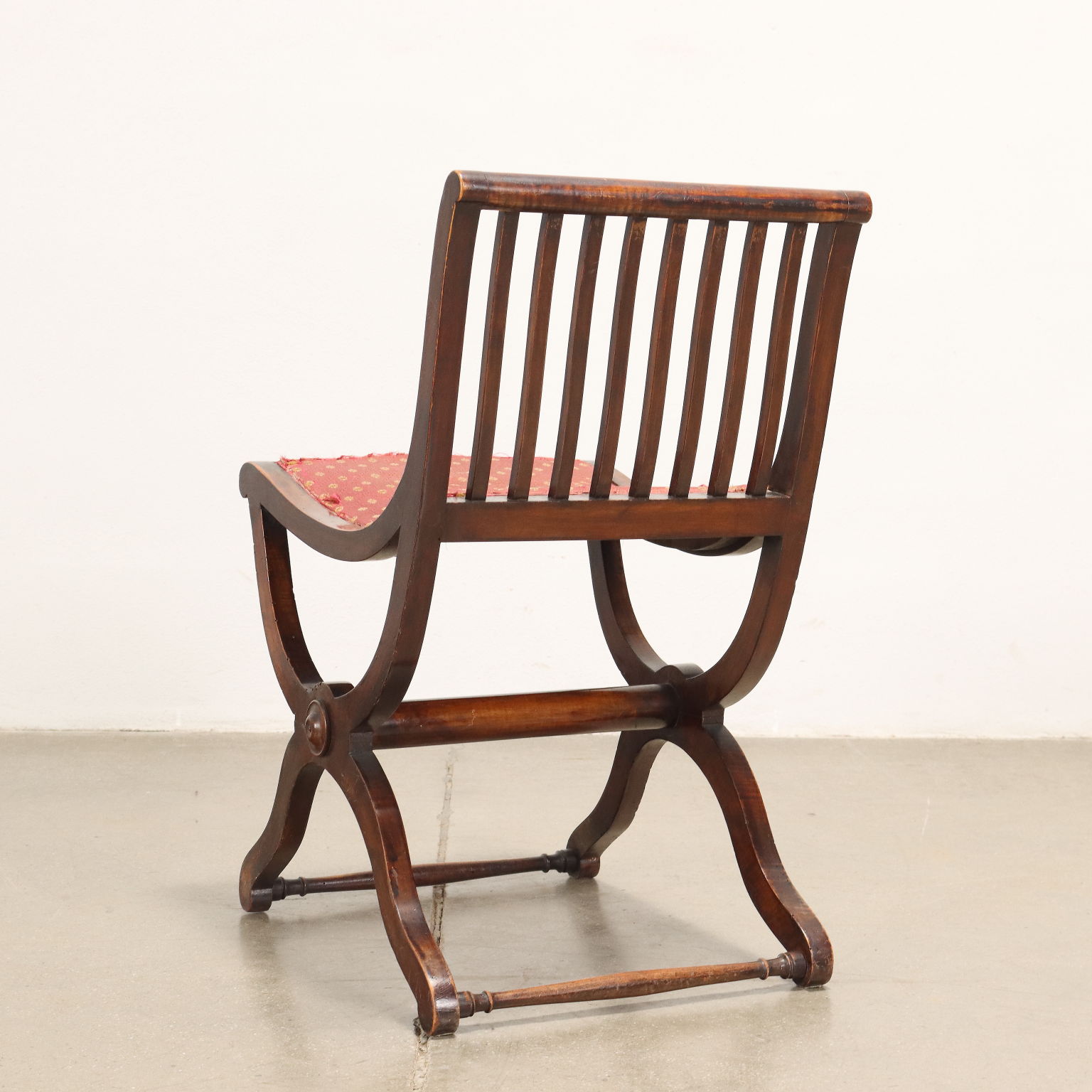 Seggiola curulea impero in noce, Italia primo quarto XIX secolo. Seduta imbottita, gambe raccordate da traverse tornite.