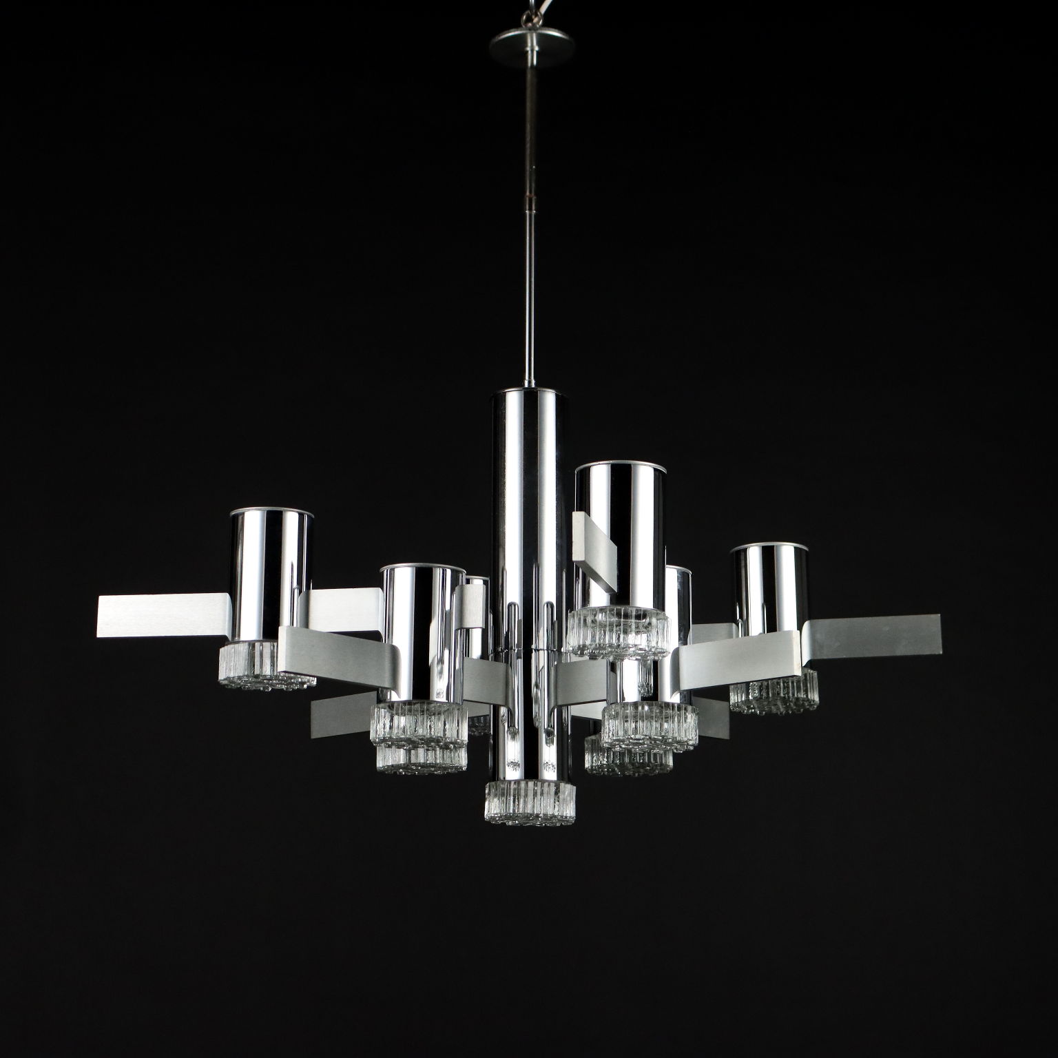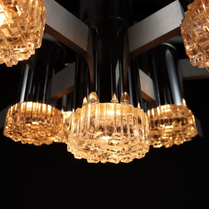 Lampada a soffitto con doppia accensione; metallo e alluminio cromati, vetro.
