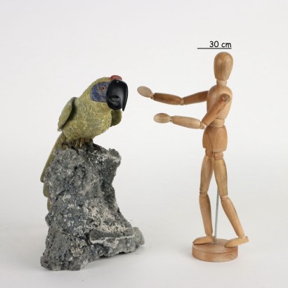 Pappagallo in varie essenze di pietre dure montato su supporto in pietra e cristalli.