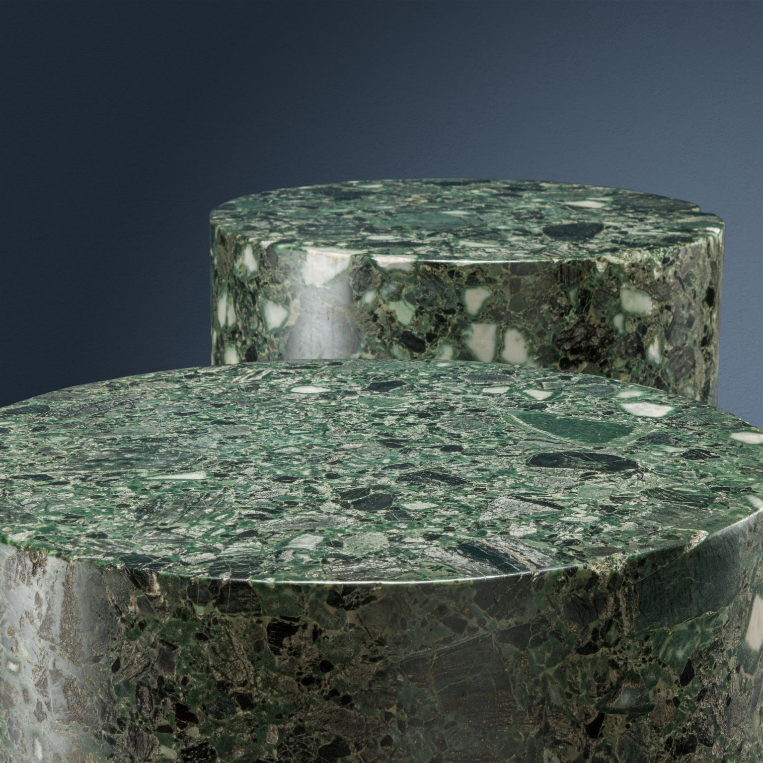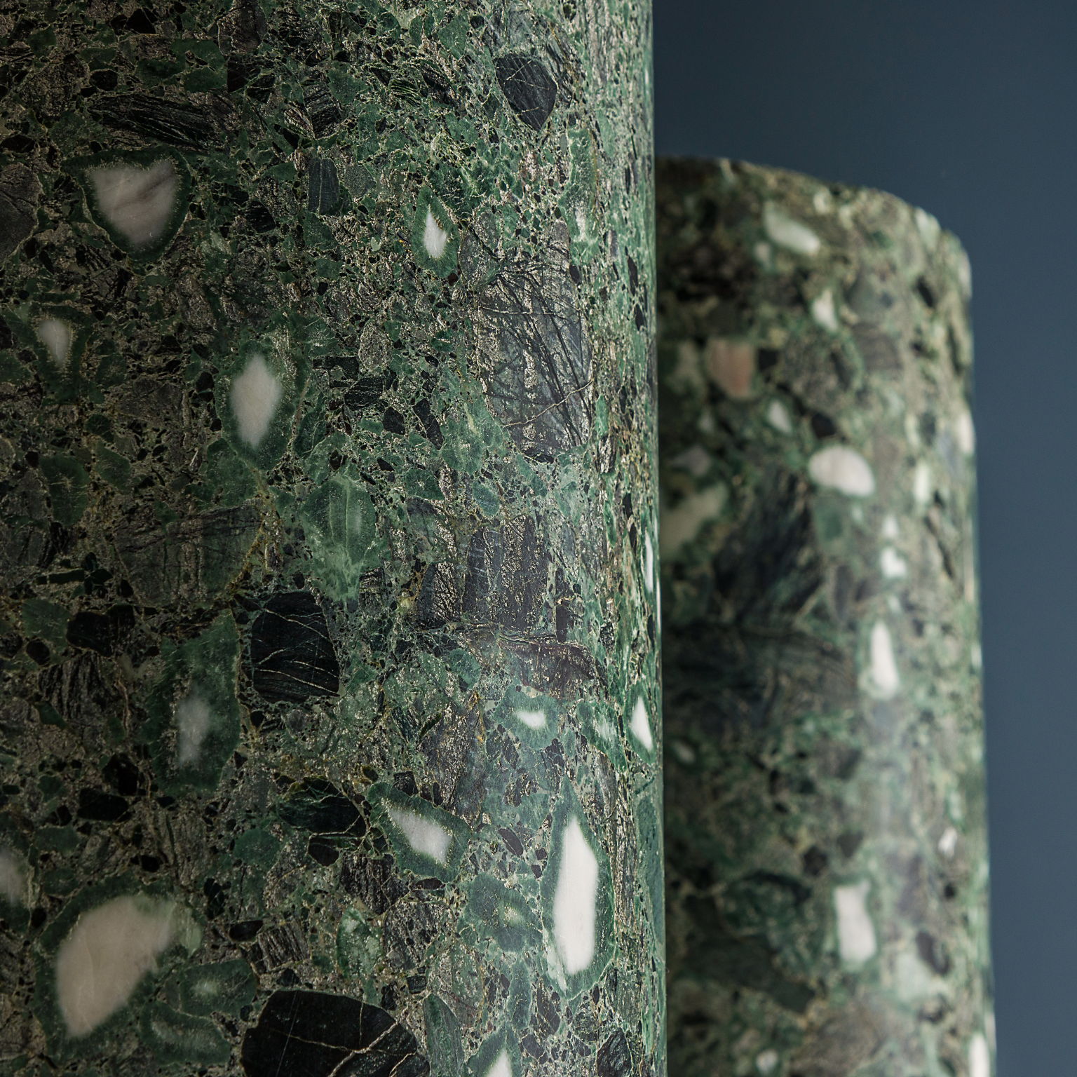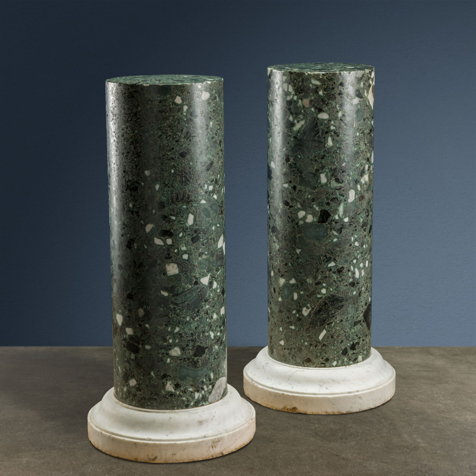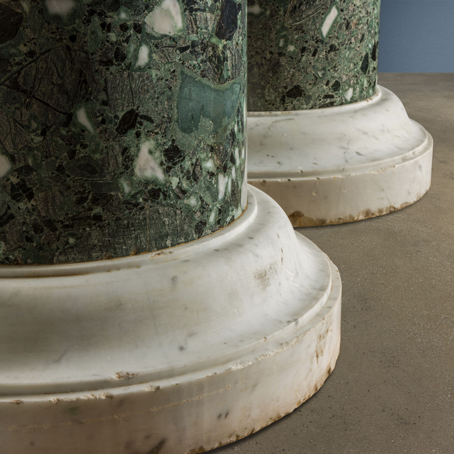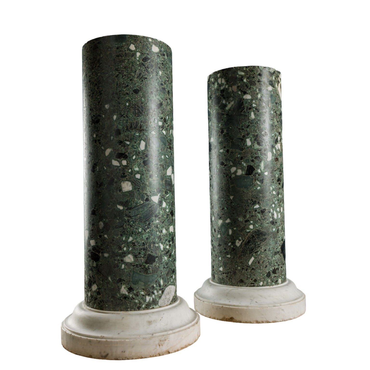 Coppia di colonne porta busto realizzate in marmo verde antico tronco, con un basamento in marmo bianco di Carrara modanato.