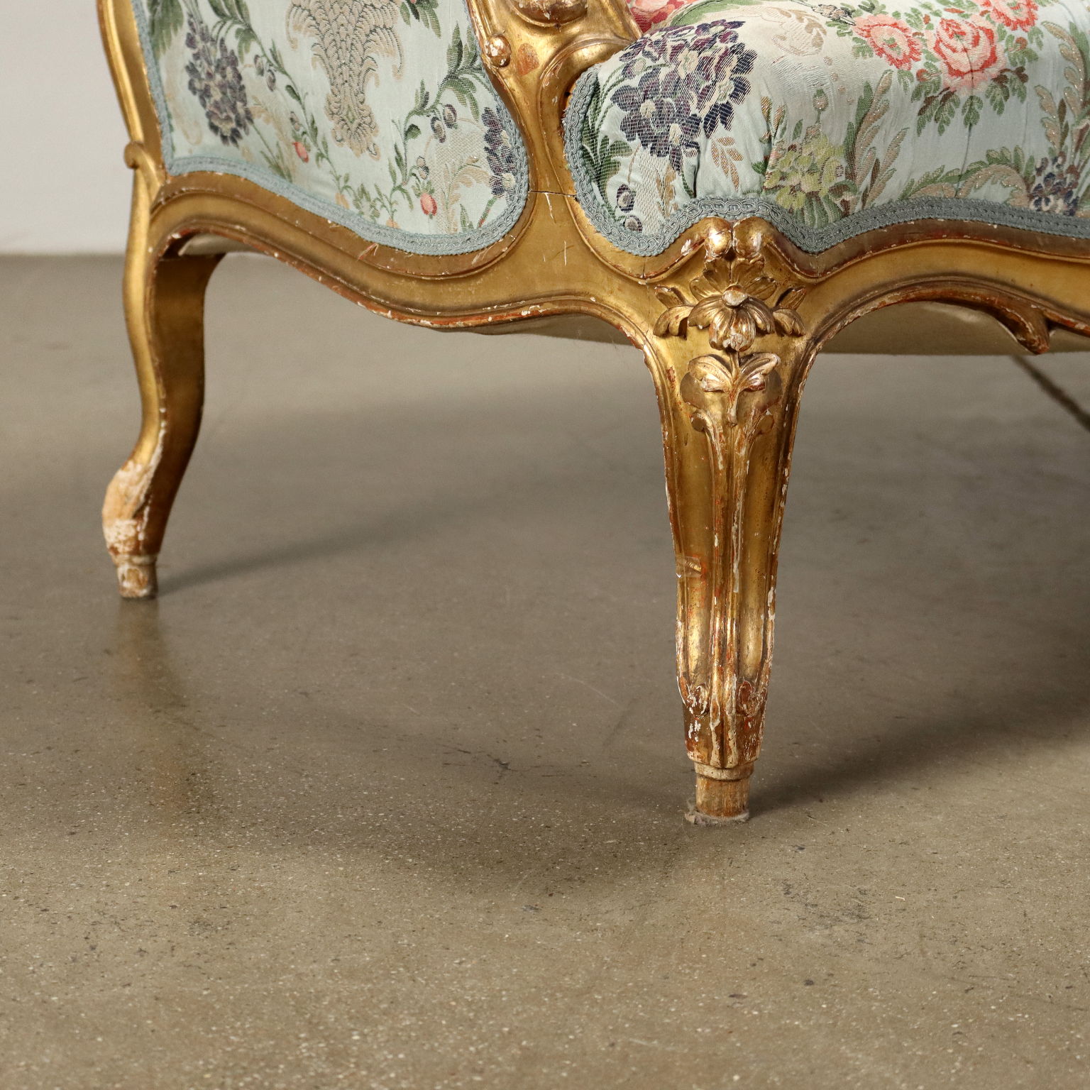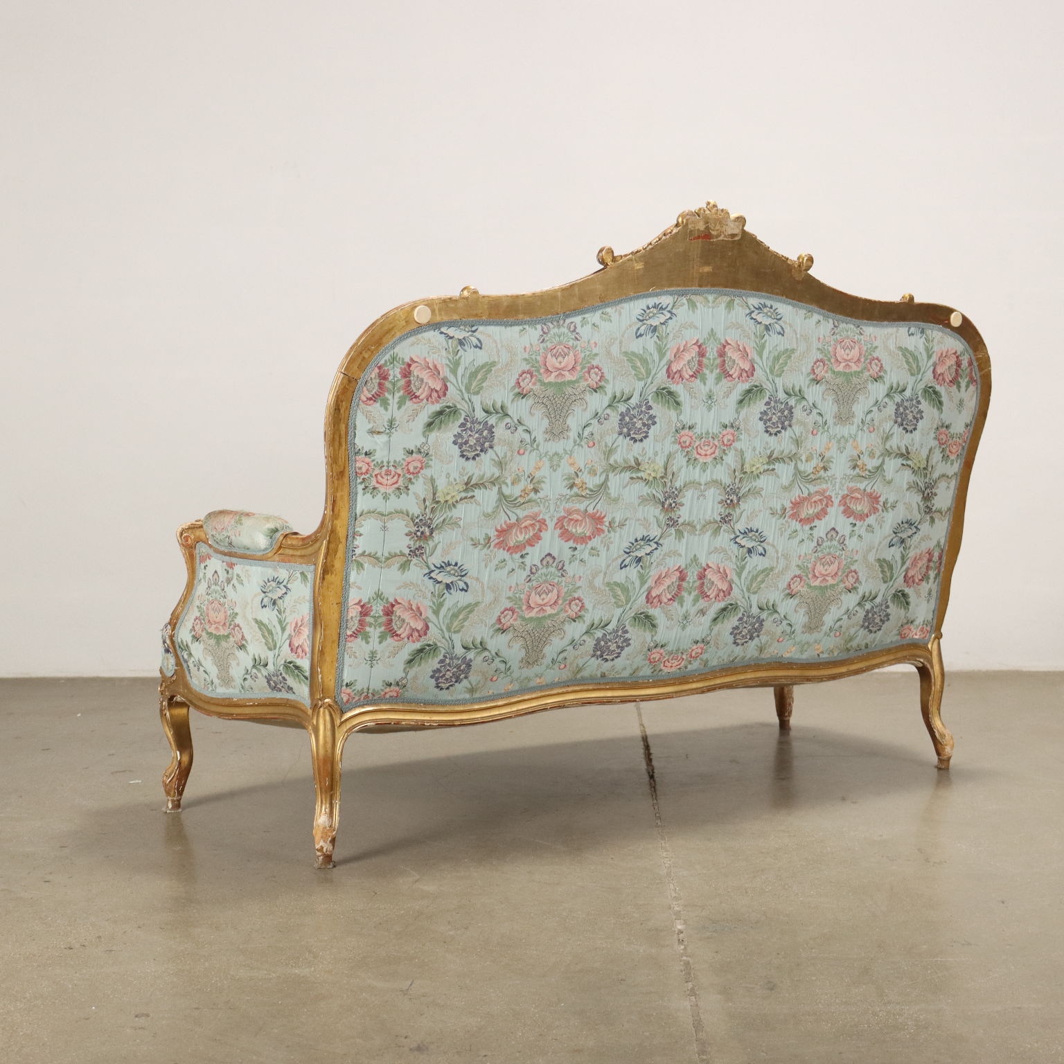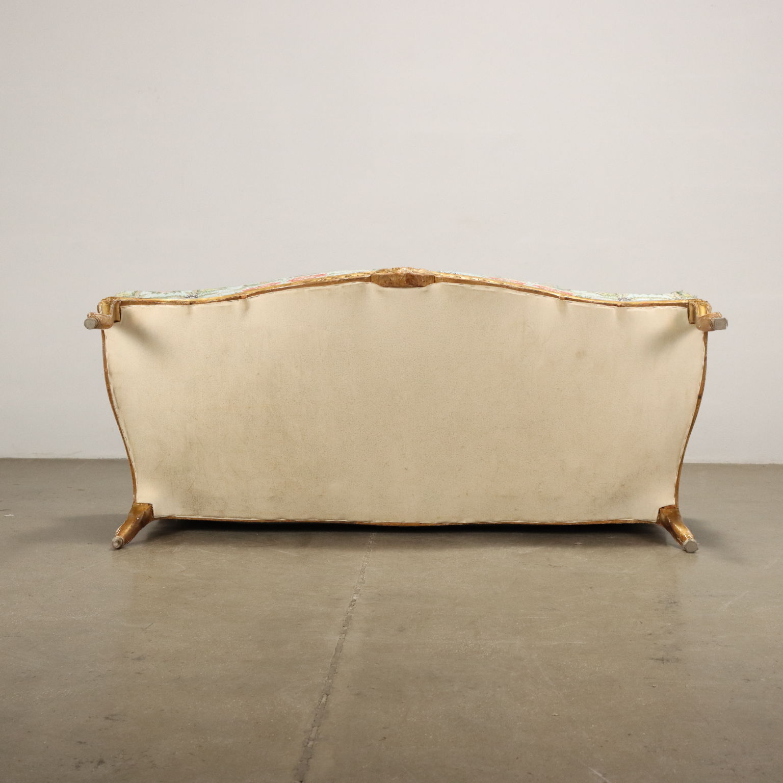 Divanetto in stile neorococò in legno intagliato e dorato, Italia seconda metà XIX secolo. Schienale, seduta e braccioli imbottiti, gambe mosse; decorato da motivi a ricciolo, coppia di conchiglie e festoni di foglie e fiori. Ricciolo di 1 bracciolo danneggiato.