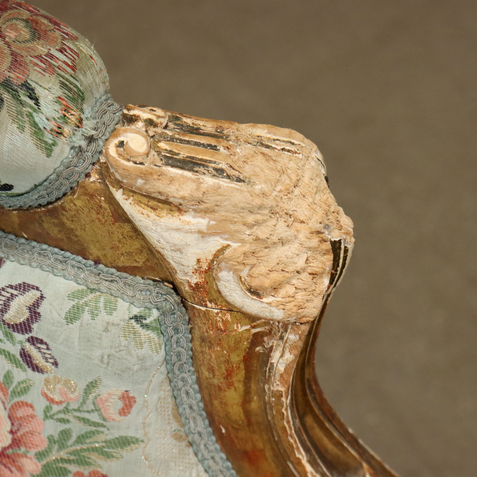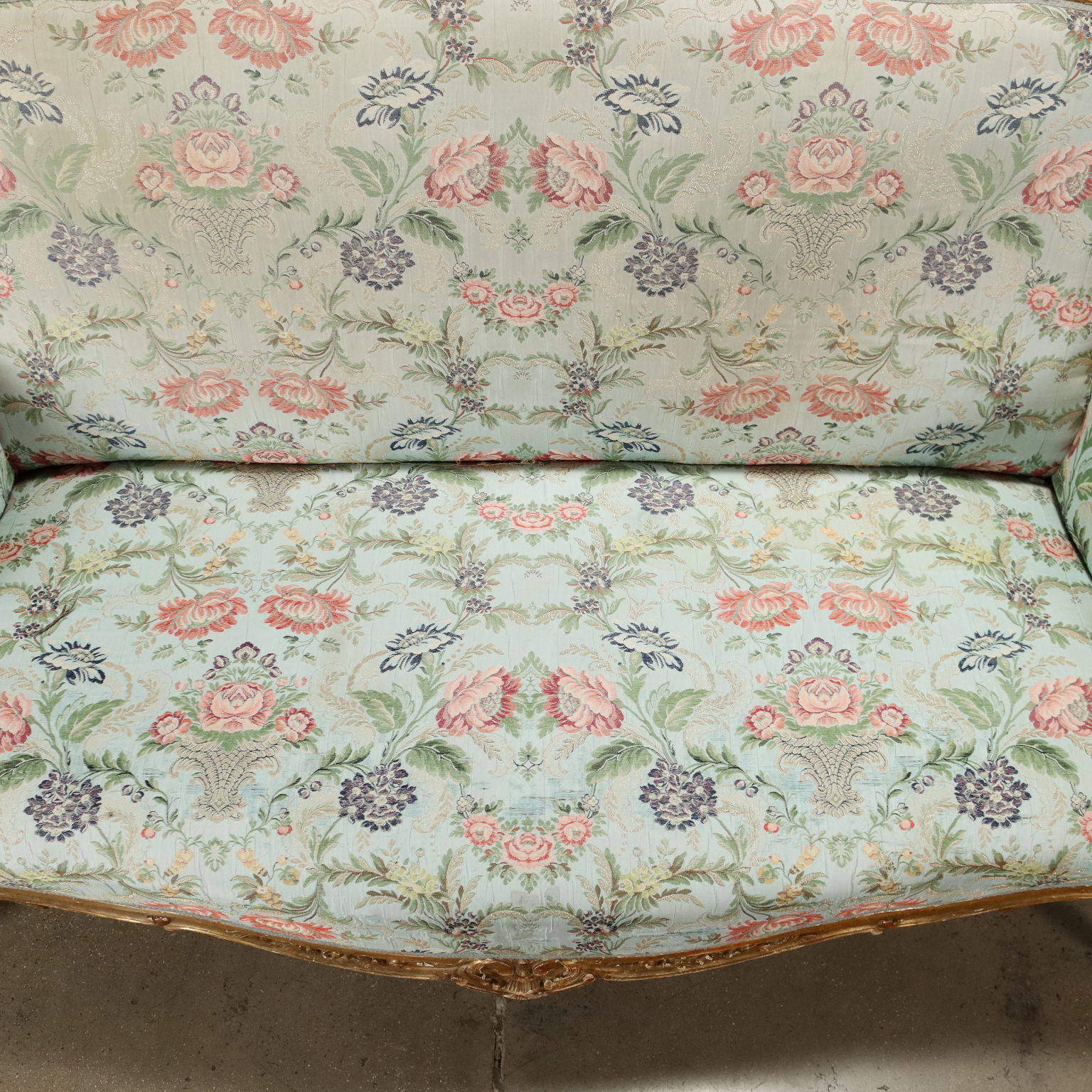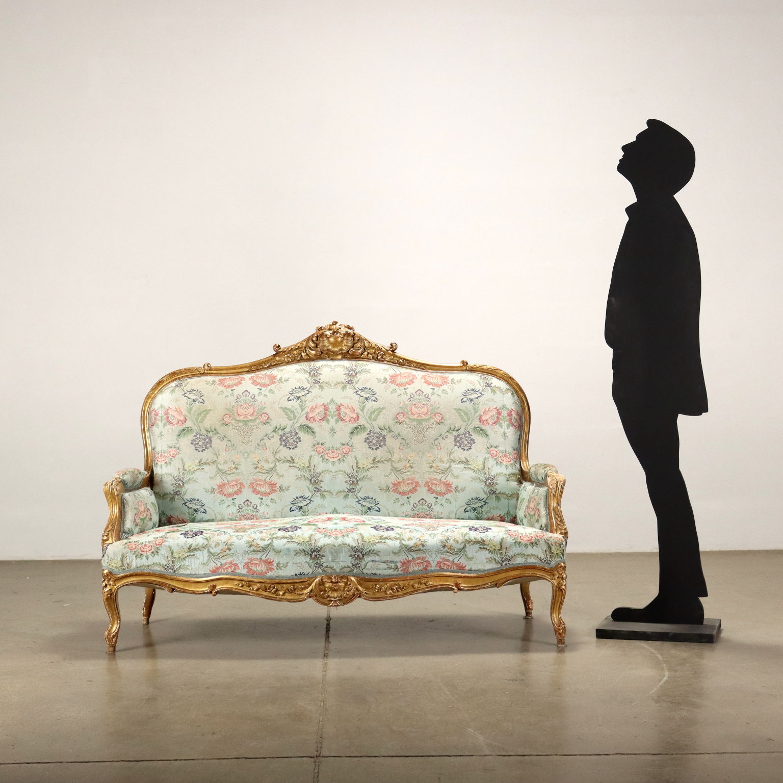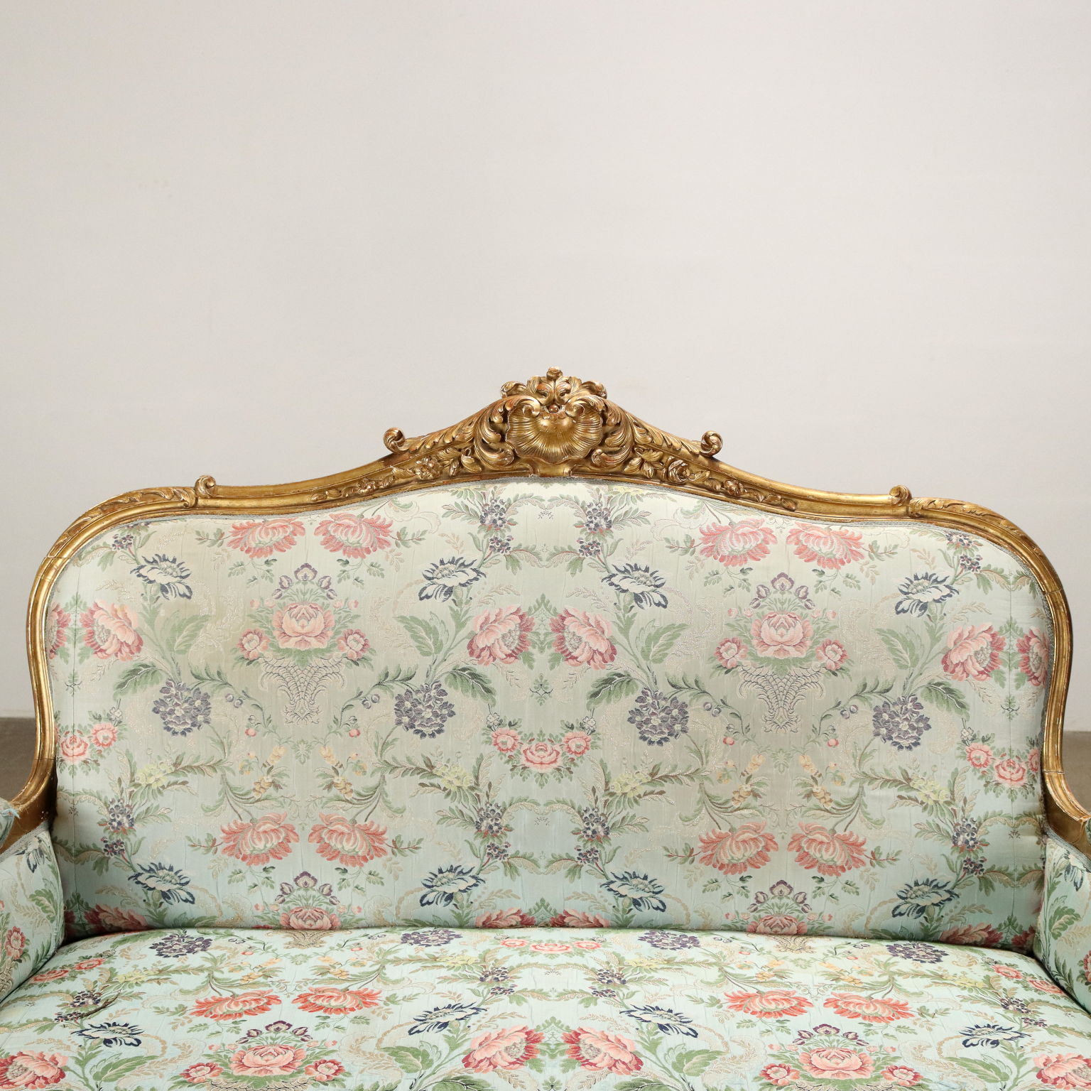 Divanetto in stile neorococò in legno intagliato e dorato, Italia seconda metà XIX secolo. Schienale, seduta e braccioli imbottiti, gambe mosse; decorato da motivi a ricciolo, coppia di conchiglie e festoni di foglie e fiori. Ricciolo di 1 bracciolo danneggiato.