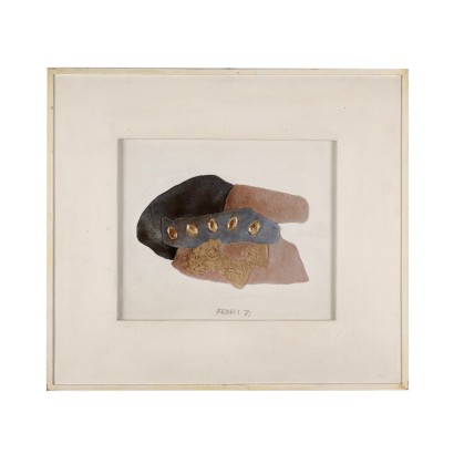 Tecnica mista su tavola. Firmato e datato in basso al centro. Al retro presenti ulteriore firma, il titolo con la numerazione 1/4 e timbro ed etichetta della Galleria d'arte "dei Mille" di Milano. Francesco Fedeli fu disegnatore e pittore. Se nella produzione di disegni spicca la sua corrispondenza di guerra, in particolare dal fronte russo di cui documentò la vita dei soldati e il dramma e le pene della popolazione russa con disegni che apparvero sui principali quotidiani e riviste italiani, successivamente la sua pittura si volse verso composizione astratte, come questa qui presentata.