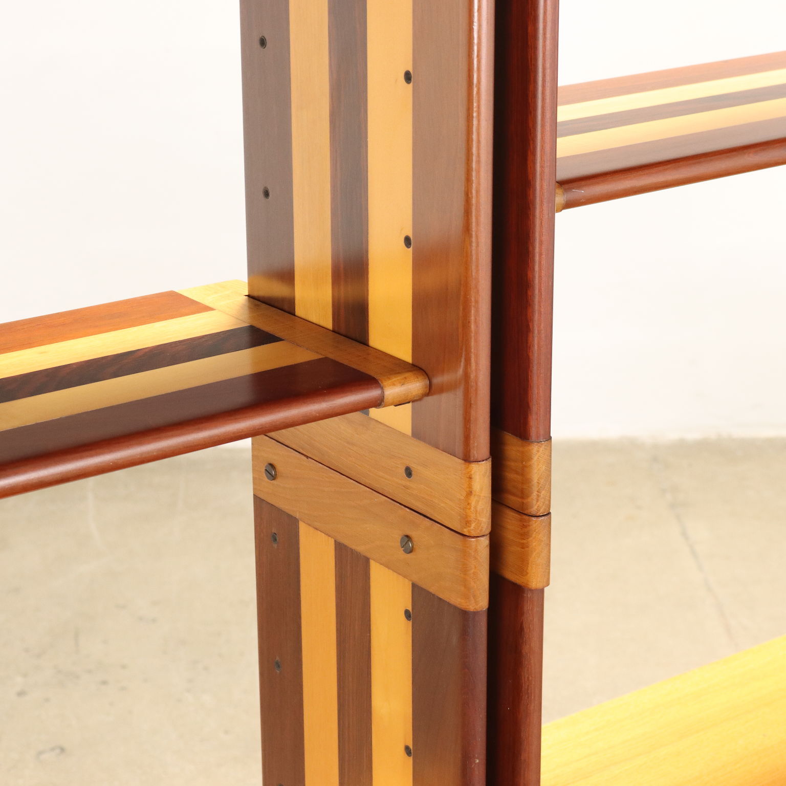 Libreria con elementi contenitori con aperture a battente e ribalta, ripiani a giorno a posizione regolabile; legno listellare di differenti essenze.