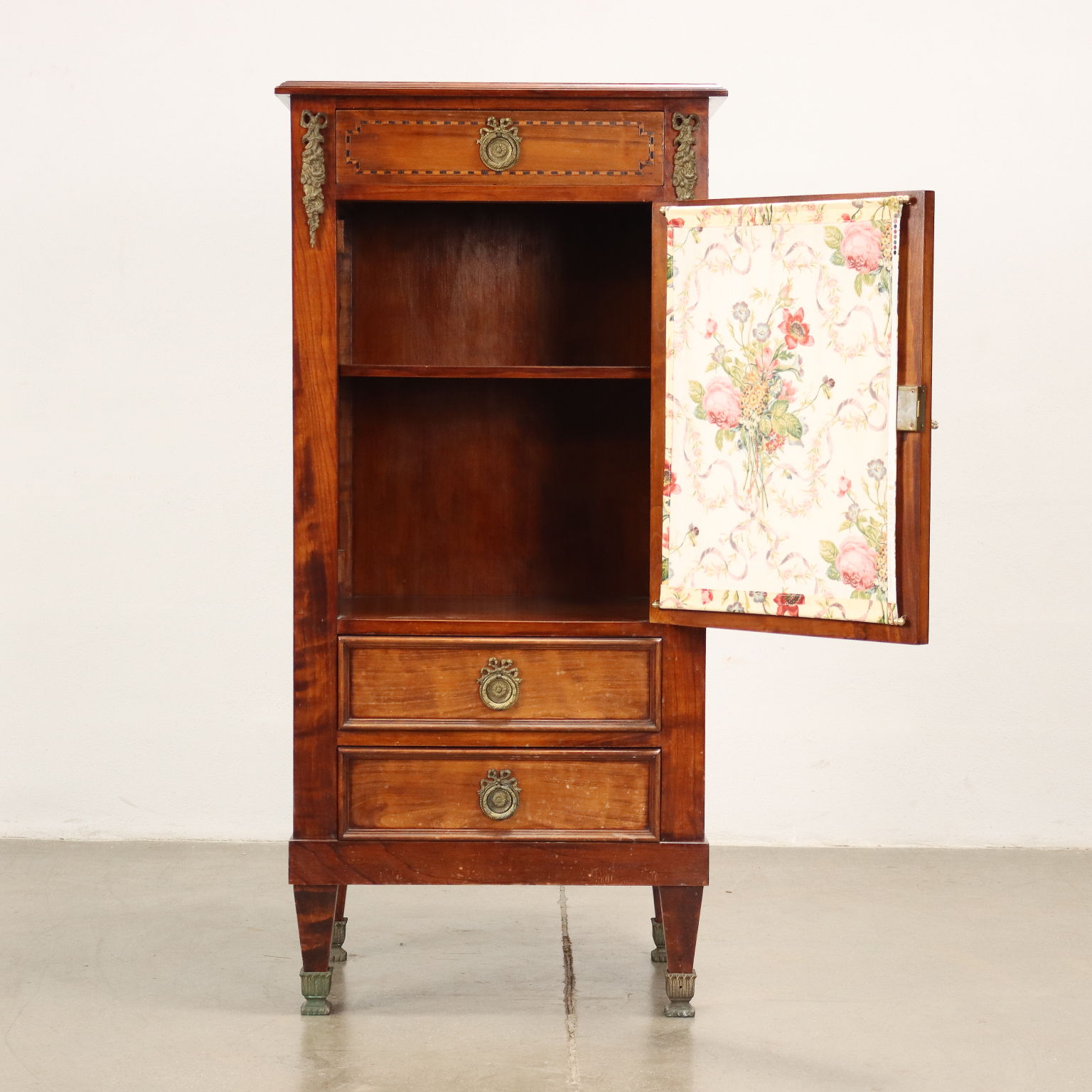 Mobile liberty in ciliegio, Italia inizio XX secolo. Fronte a 3 cassetti e anta in vetro con tessuto floreale, lati pannellati, gambe troncopiramidali con scarpette bronzee. Ornato da applicazioni in bronzo dorato di gusto neoclassico e da intarsi geometrici sul fronte del cassetto posto nella fascia.