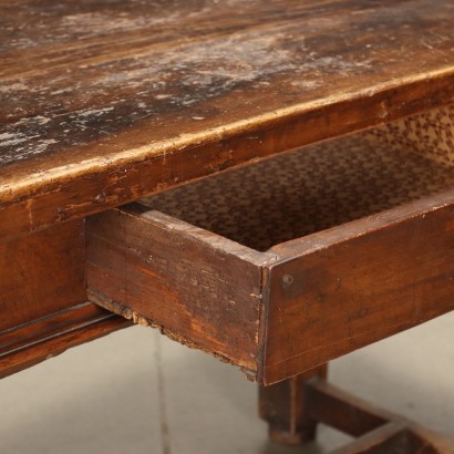 Tavolo a rocchetto in noce, realizzato con parti antiche, Italia XX secolo. Fascia sottopiano con cassetto, gambe tornite terminanti a plinto e raccordate da traverse. Interni abete. Necessita di restauro.