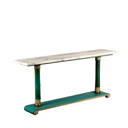 Mobile a giorno in stile, Francia, XX secolo. Piano superiore in marmo sorretto da struttura in legno dipinto, montanti a colonna con basi e capitelli intagliati e parzialmente dorati. Piano inferiore di appoggio terminante in volute a ricciolo.