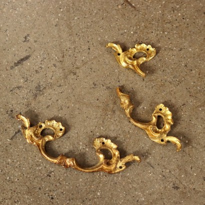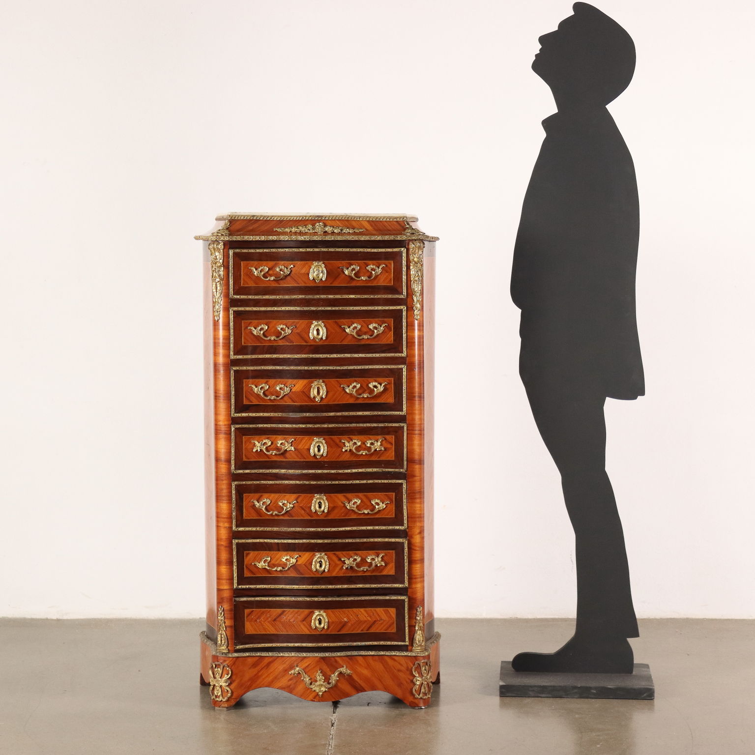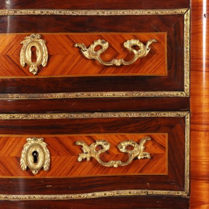 Secretaire impiallacciato in bois de rose con piano in marmo e fronte con finti cassetti celanti ribalta nella parte superiore. Scarabattolo con vano superiore, cassettini impiallacciati in acero con bordature più scure e panno viola. Ornamenti su tutto il corpo del mobile in bronzo dorato raffiguranti motivi floreali, facce grottesche e greche. Interni in rovere. Mancanze.