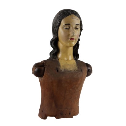 Busto femminile di manichino da artista in legno parzialmente laccato e dipinto, Italia metà XIX secolo. Sul retro reca le seguenti parole, parzialmente decifrate: ”Luigi Banzolini 1850 Laviana(?)” e “Coniata(?) 1855”. Il busto, originariamente a figura intera, è mancante delle braccia e della parte inferiore.