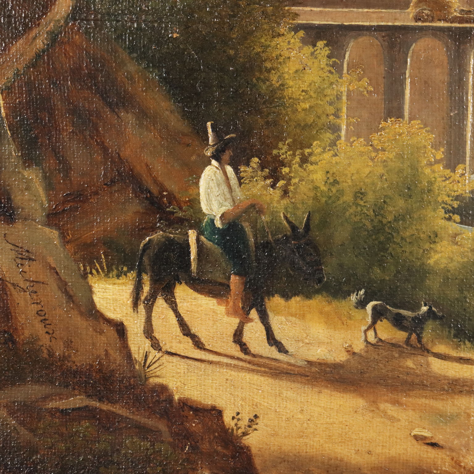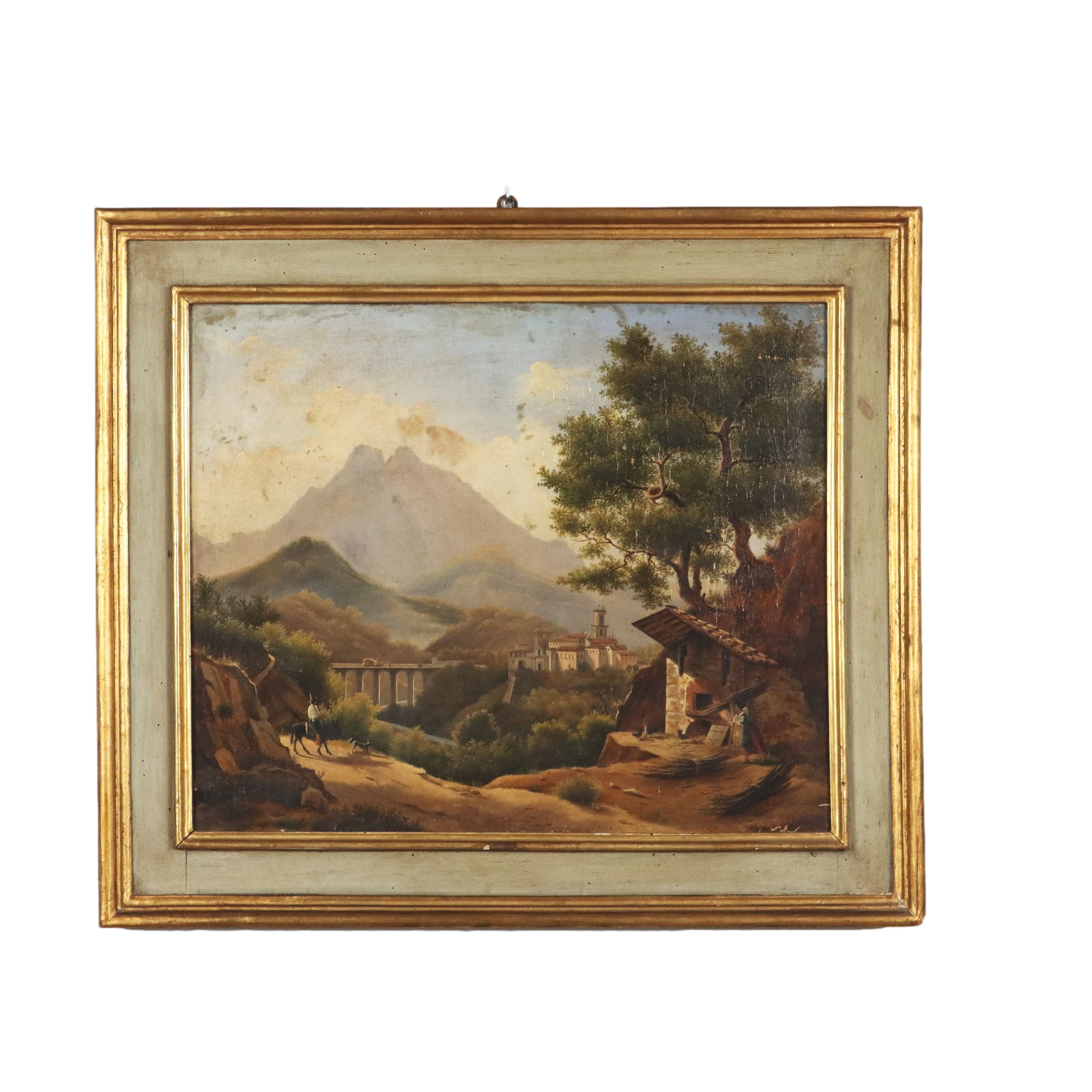 Olio su tela. Firmato in basso a sinistra. La veduta paesaggistica propone in primo piano un sentiero di montagna che conduce ad un forno per il pane, ove una donna prepara le fascine di legna per il fuoco, mentre un viandante si avvicina a dorso d'asino; nella valle il viadotto sul fiume che conduce al villaggio, sormontato da altre cime brulle. Micheroux, appartenente alla scuola di Posillipo, ovvero la scuola ottocentesca di artisti napoletani dediti alla pittura di paesaggio, realizzò diversi scorci dell'entroterra campano, ma poco è rimasto della sua produzione e poco si sa della sua vita. Il dipinto presenta alcune piccole cadute di colore. E' presentato in cornice di fine '800.