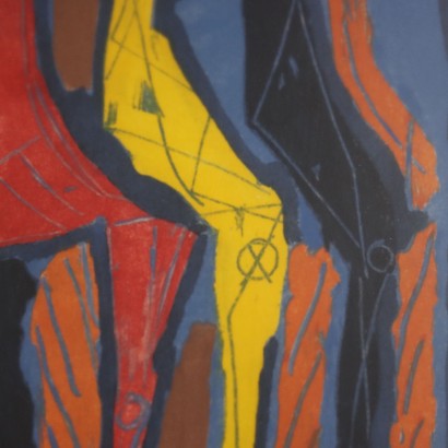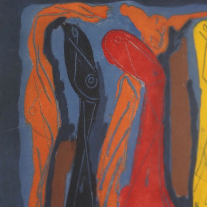 Acquaforte, acquatinta a colori. Firmata con sigla MM a destra; a sinistra la sigla P.A. (prova d'autore). Al retro timbro con i dati dell'opera e firma. Il famoso artista senese Marino Marini è ampiamente noto per la sua importante produzione artistica, che spaziò dal disegno e la pittura, soprattutto dei suoi anni giovanili, alla scultura, che lo fece conoscere al pubblico e alla critica, e gli avvalse i primi riconoscimenti. Sue opere si ritrovano in tutto il mondo. La litografi appartiene alla serie nominate "Marino from Goethe" realizzate dall' artista negli anni '70, e che comprende differenti disegni sullo stesso tema. Quello qui presentato corrisponde al soggetto IV. Presentato in cornice a vista.