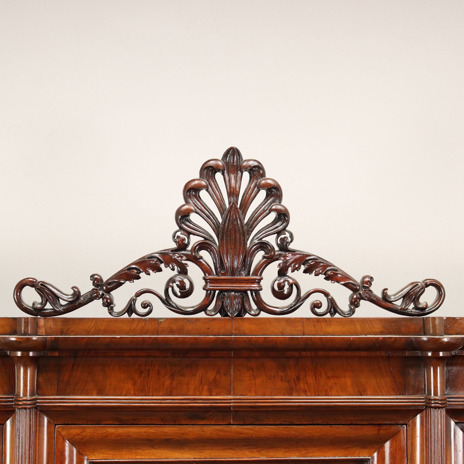 Armadio Carlo X a tre ante con cimasa intagliata e traforata con antemio centrale, motivi fogliacei laterali e pigne sugli spigoli. Anta centrale dotata di specchio e pannelli delle ante laterali in noce a sostituire pannelli di vetro. Tre cassetti nella fascia inferiore, montanti grissinati e piedi a trottola. Schienali superiori sostituiti con compensato.