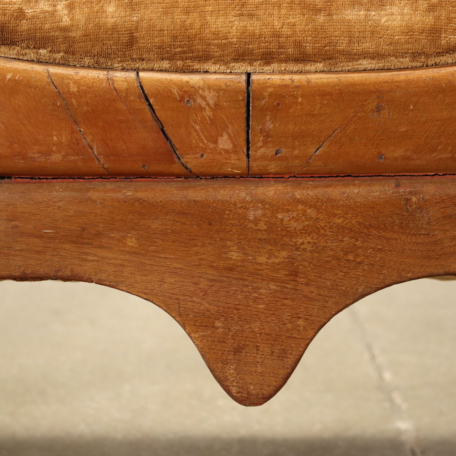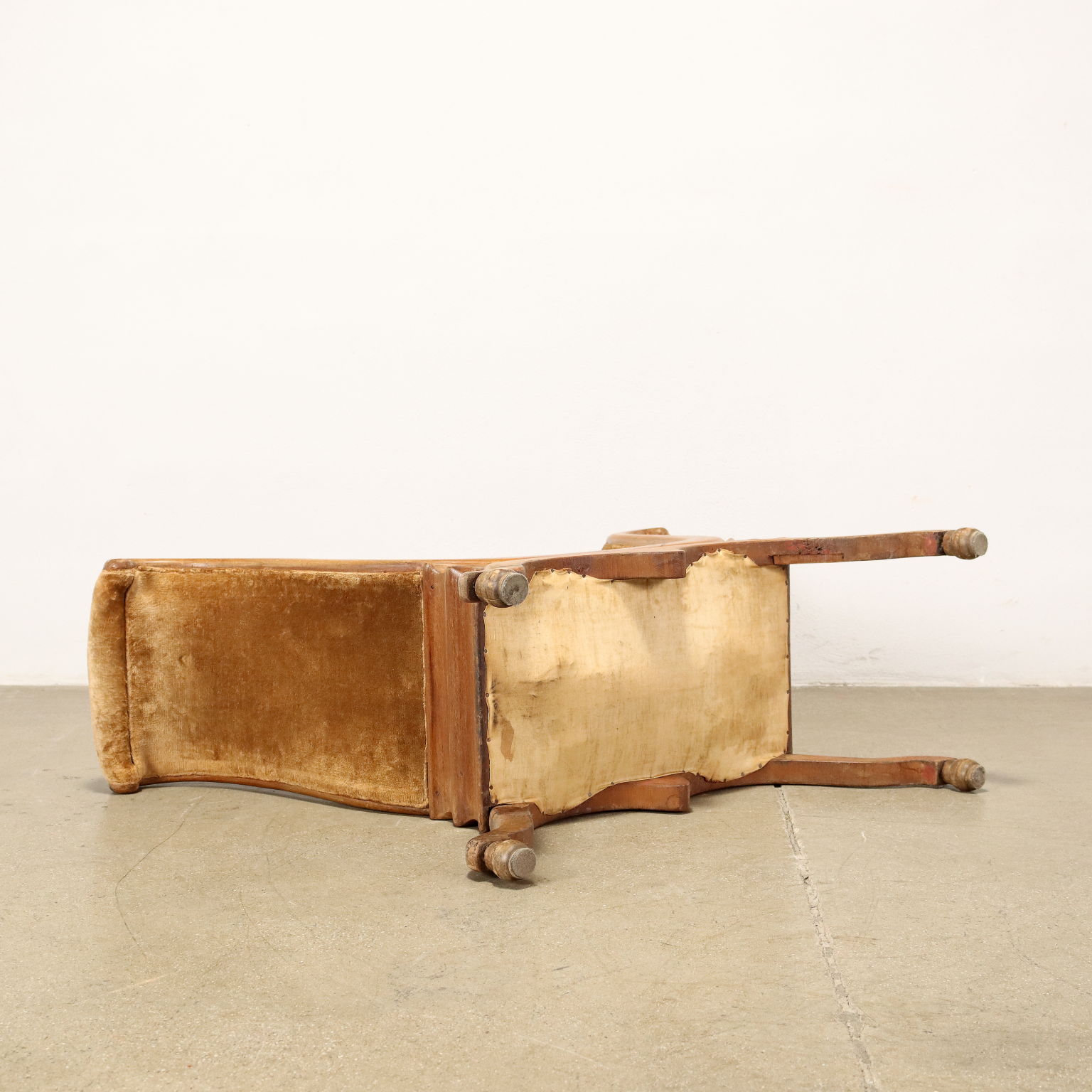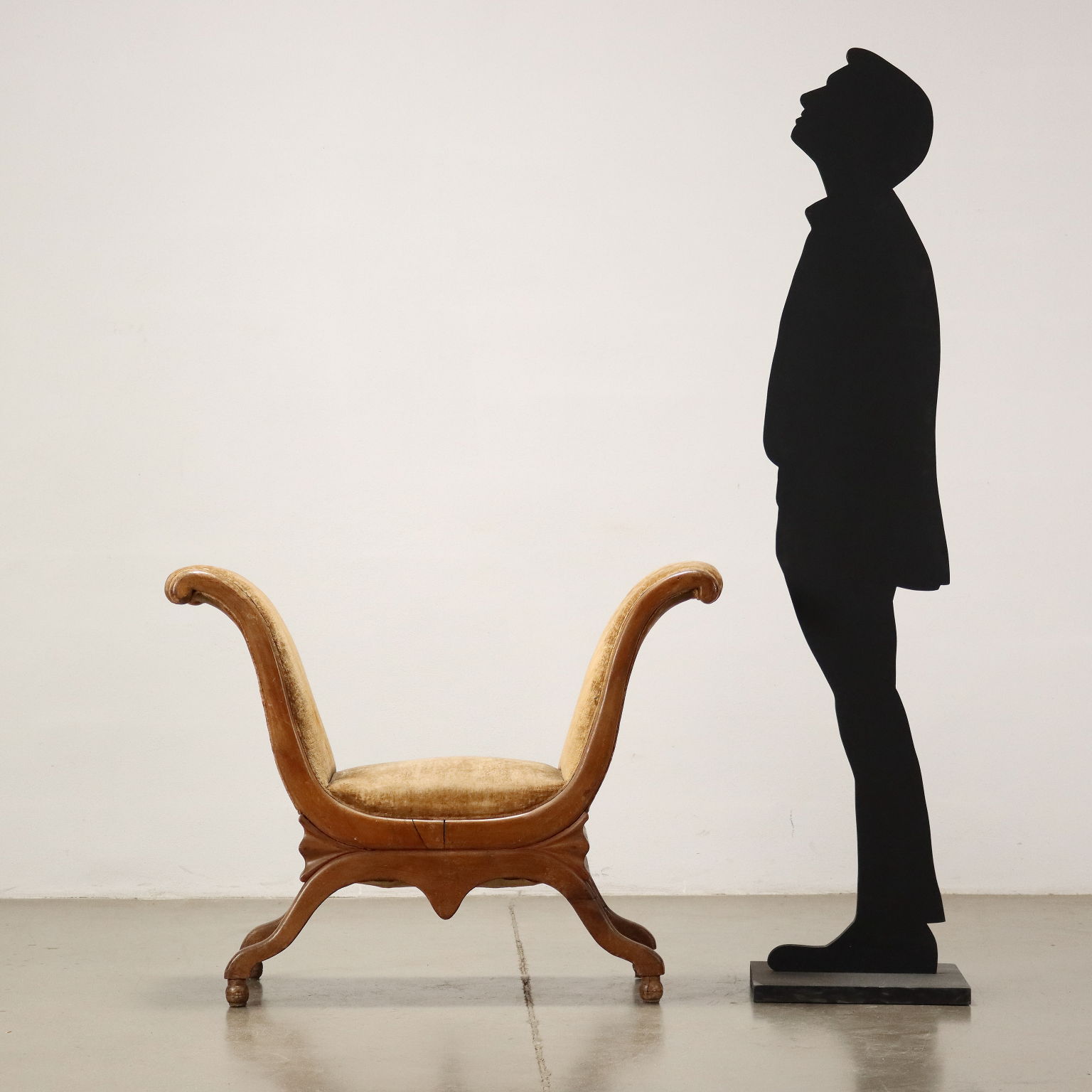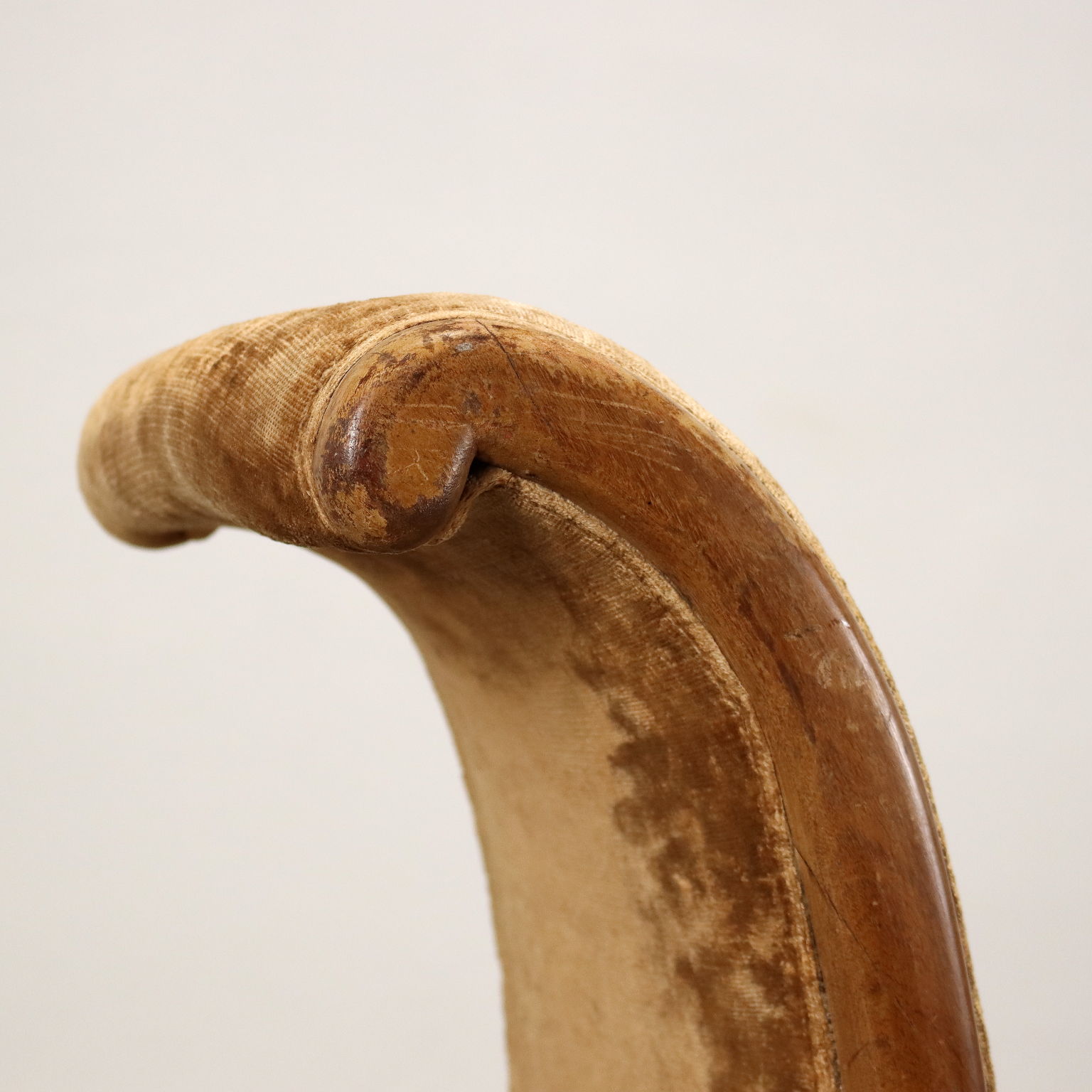 Seduta curulea con alti braccioli terminanti in ricciolo imbottiti in continuità con la seduta. Le ruote originali sono state sostituite con piedini torniti.