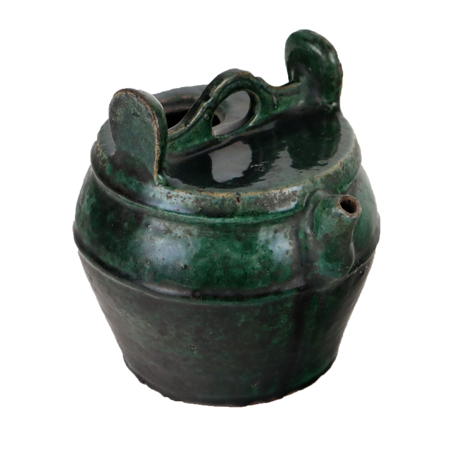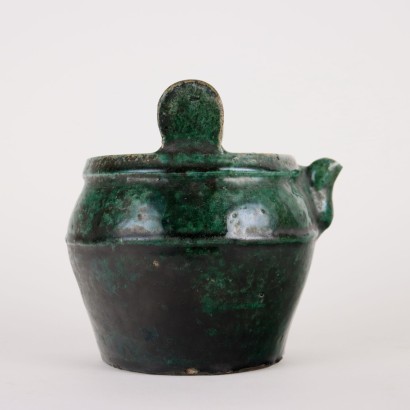 Recipiente per il trasporto dell'acqua in ceramica invetriata color verde oliva. Realizzato in modo miniaturistico poiché facente parte di un corredo funerario.