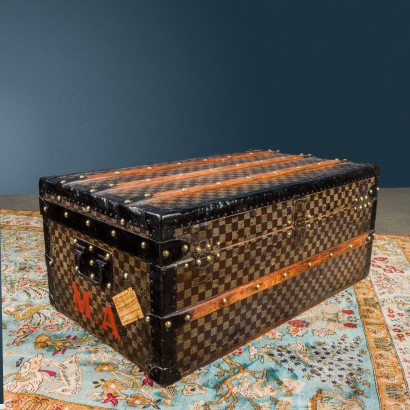 Baule Louis Vuitton degli ultimi anni dell'Ottocento, restaurato e riportato alle condizioni originali. Si tratta di un malle cabine, ovvero un baule dalla forma compatta e dimensioni ridotte, creato per essere riposto sotto il letto delle cabine dei transatlantici. Rivestito in tela Damier, tessuto caratterizzato da motivi a scacchi e inventato pochi anni prima da Georges Vuitton, figlio di Louis. La serratura è in ottone, i chiodi sono marchiati, le finiture in ferro e legno. Le iniziali “M. A.”, poste su entrambi i lati corti, forniscono indicazioni riguardanti il primo proprietario. Interno rivestito con la classica carta a righe e dotato dell'etichetta originale recante il numero univoco del prodotto (200382); assente il ripiano superiore. Realizzato dalla Maison su commissione speciale, avente larghezza pari a 75 cm (larghezza standard 80 cm). È raro trovare bauli di quest'epoca con la tela conservata in condizioni così buone. I bauli Louis Vuitton, oggetti iconici di arredo e da collezione, sono ancora oggi resistenti e impermeabili, esempi di grande artigianato.