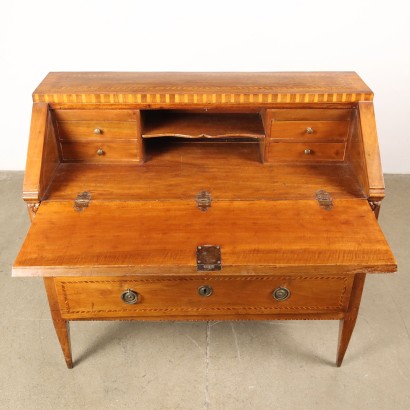 Ribalta in noce con bordure in acero e bois de rose su piano e fronte con anta e due cassetti. Montanti decorati con dettaglio intagliato appena sotto la ribalta e piedini tronco piramidali. Interni in abete. Restauri e modifiche.