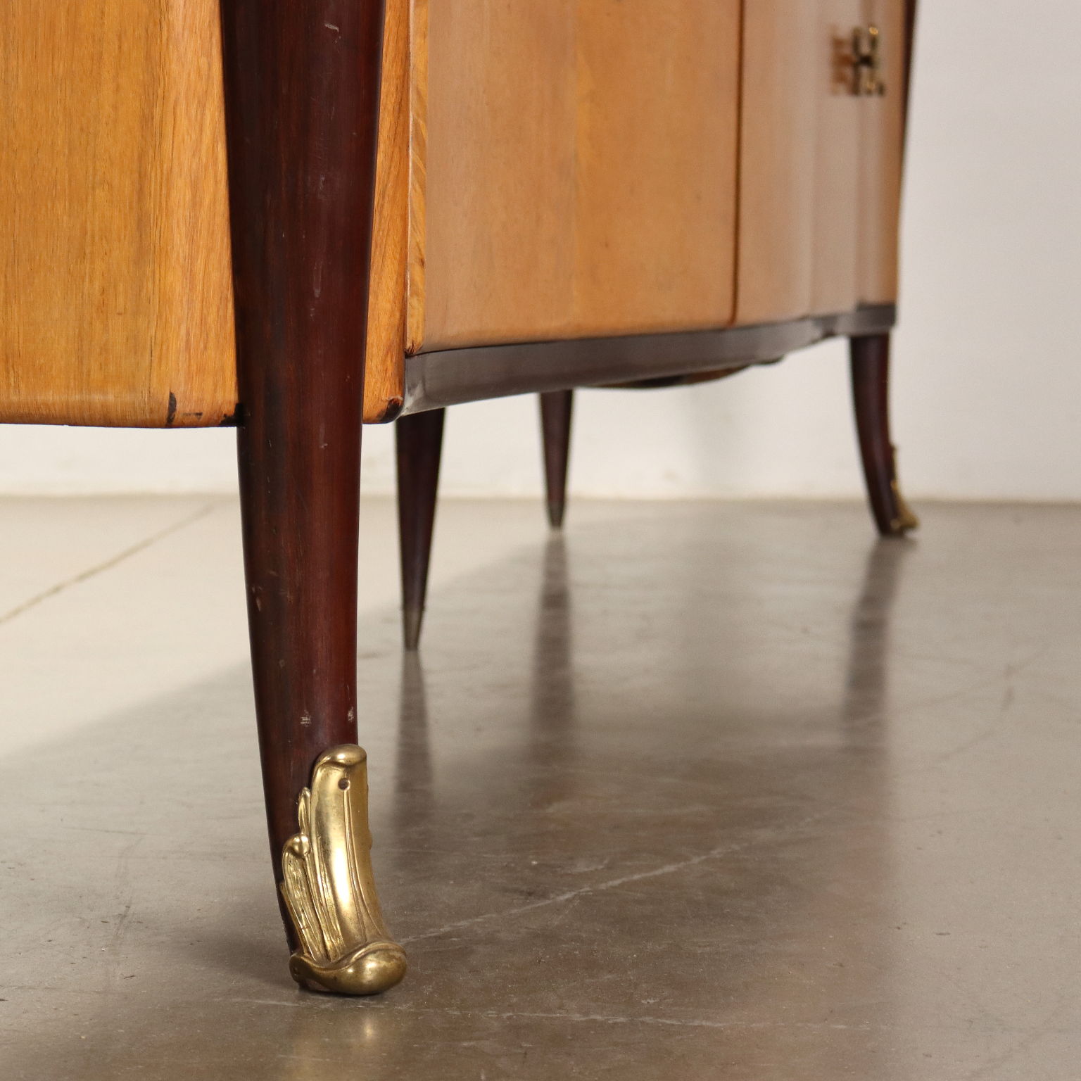 Descrizione Buffet con grande specchio decorato ad ante battenti in legno impiallacciato radica, legno esotico e maniglie in ottone, gambe in legno di faggio tinto con puntali in ottone e piano in vetro opalino nero.