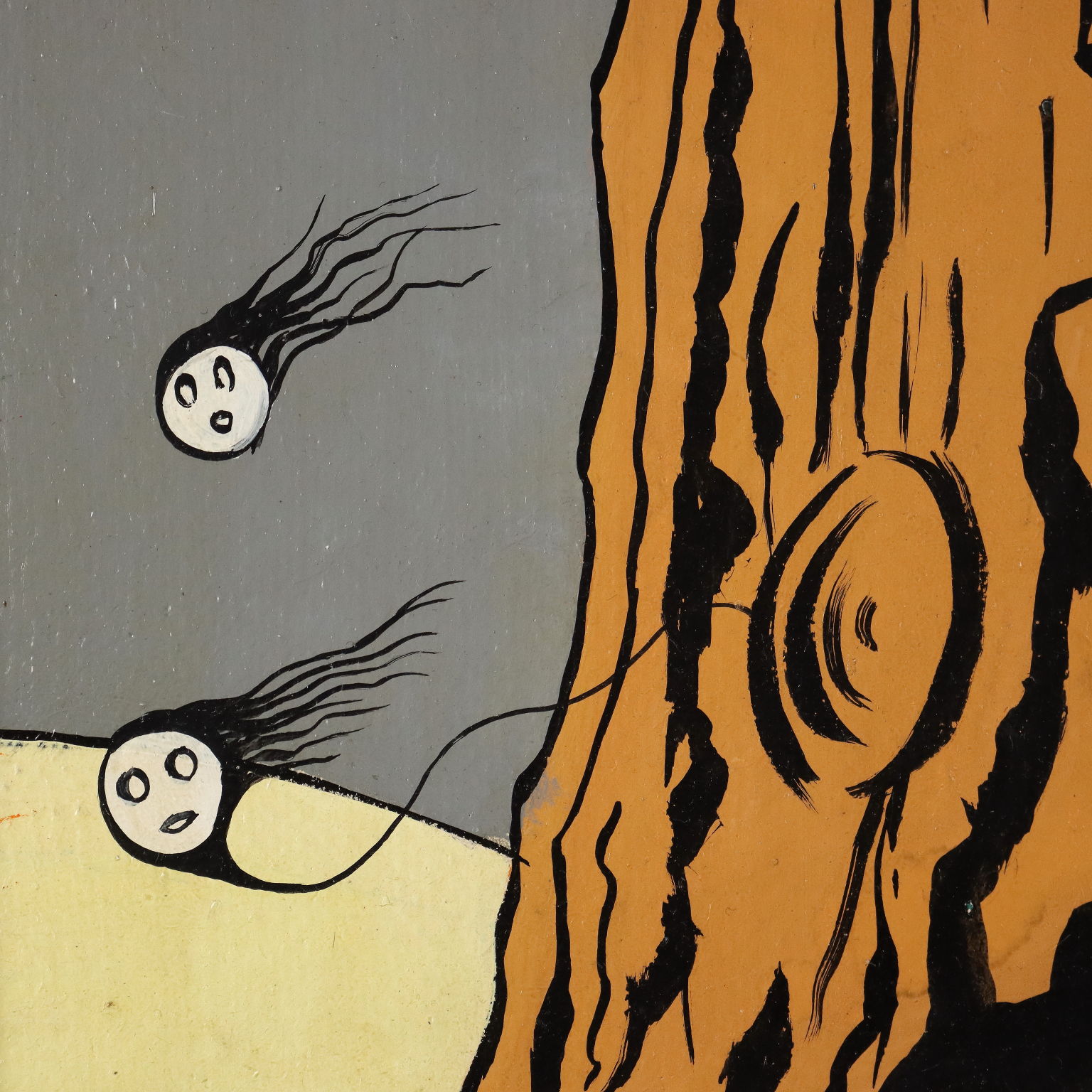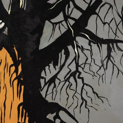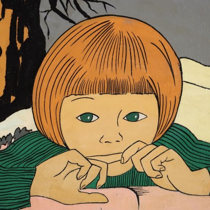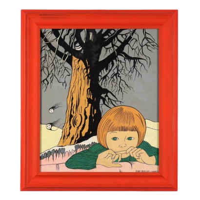 Acrilico su tela. Firmato e datato in basso a destra. L'opera di stile surreale presenta in primo piano sulla destra un volto di bambina, dietro la quale si erge piuttosto inquietante un albero spoglio, dal quale si distaccano due creature fantastiche, spiritelli in forma di gocce volanti; il paesaggio all'intorno, o la parvenza di paesaggio, evoca neve e solitudine. L'espressione e la posa, con le due mani davanti alla bocca quasi ad impedirsi di gridare, rivelano una bambina inquieta, forse addirittura spaventata, ma comunque anche incuriosita da ciò che accade alle sue spalle. Anche i colori utilizzati, tinte pastello senza contrasti accesi, contribuiscono a non caricare di drammaticità e spavento la scena, quanto piuttosto a stemperarne la tensione nell'illusione favolistica. Le fattezza del viso della bambina si ritrovano anche in altre opere dell' artista, così come la posa delle mani. Lo stile pittorico è proprio di Dino Buzzati che, nelle sue narrazioni pittoriche, parallele alle creazioni letterarie, racconta un universo di realismo magico, un livello di realtà in cui sussistono sogno, magia e viva corporeità. Pur subendo le fascinazioni avanguardiste del secolo, Buzzati pittore ha saputo fondere nelle sue opere intuizioni surrealiste, immaginifici ex voto, ardite figurazioni pop art, creazioni metafisiche, ma preservando sempre un sottofondo ottimista e un po' ingenuo: nelle sue opere traspare comunque sempre il pensiero dell'alba che dissipa gli incubi e l'angoscia della notte; è stato detto di lui che" forse ancor più che la sua narrativa, la sua pittura ha efficacia terapeutica e morale".