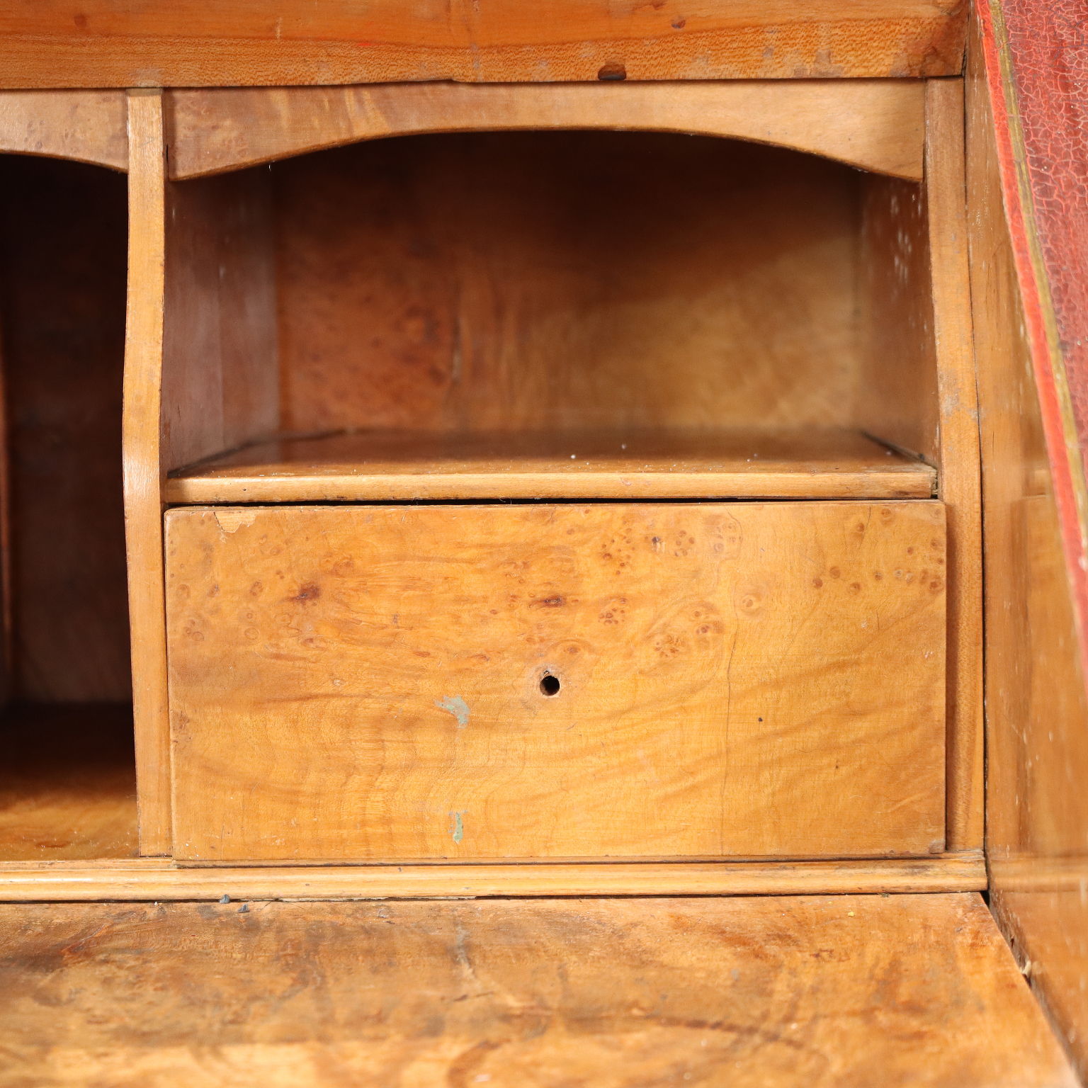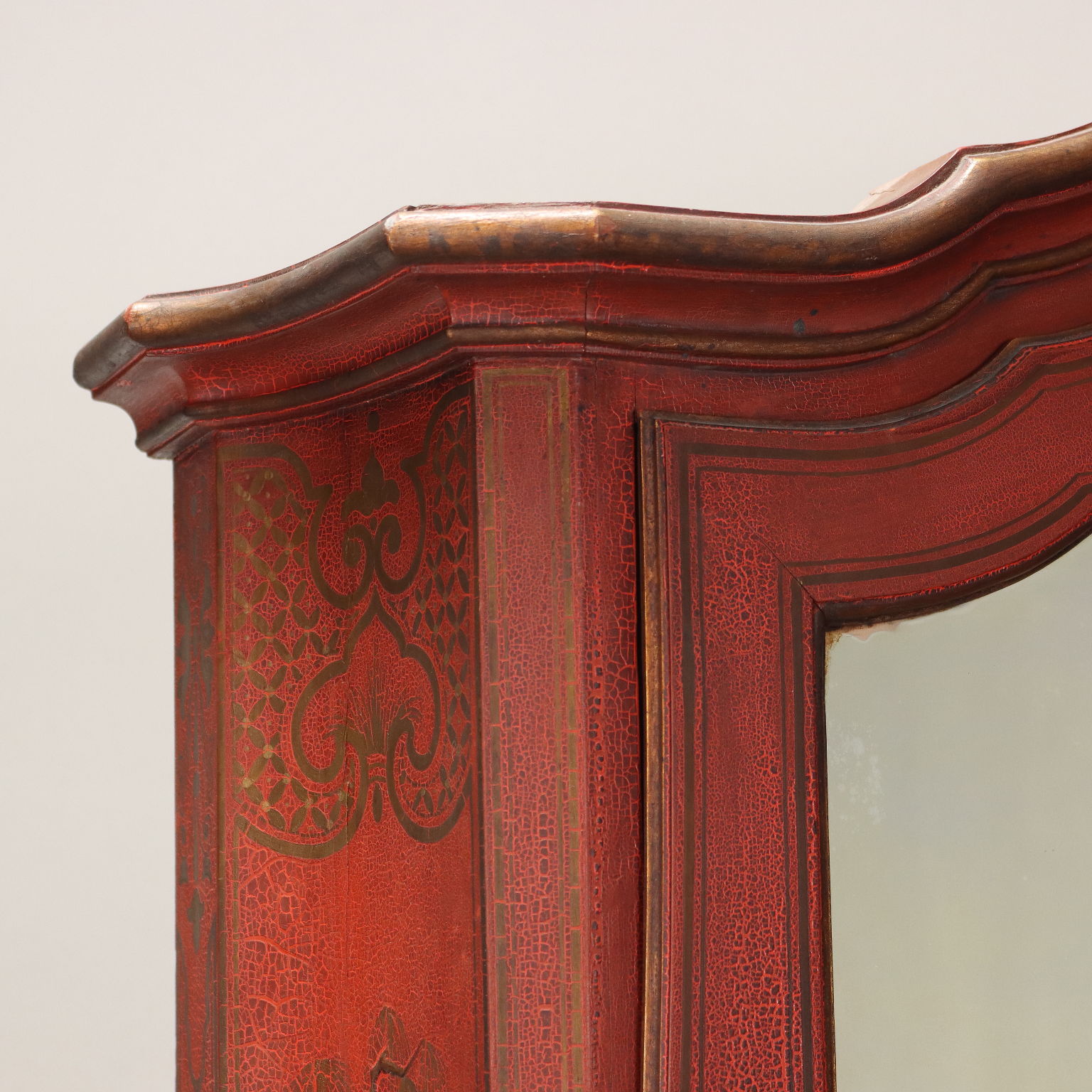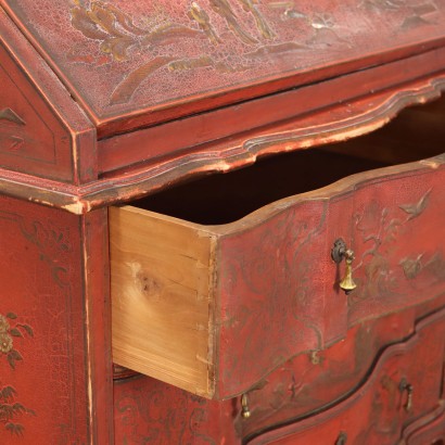 Trumeau con alzata con specchio lavorato ad acido con raffigurazione di figura femminile al centro e cornice di legno intagliato e dipinto. Fronte con anta a ribalta celante scarabattolo con vani e cassettini impiallacciati in radica e tre cassetti nella fascia inferiore. Tutta la struttura è riccamente decorata con figure in rilievo dipinte a chinoiserie su fondo rosso.