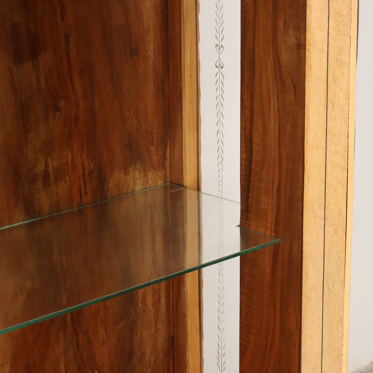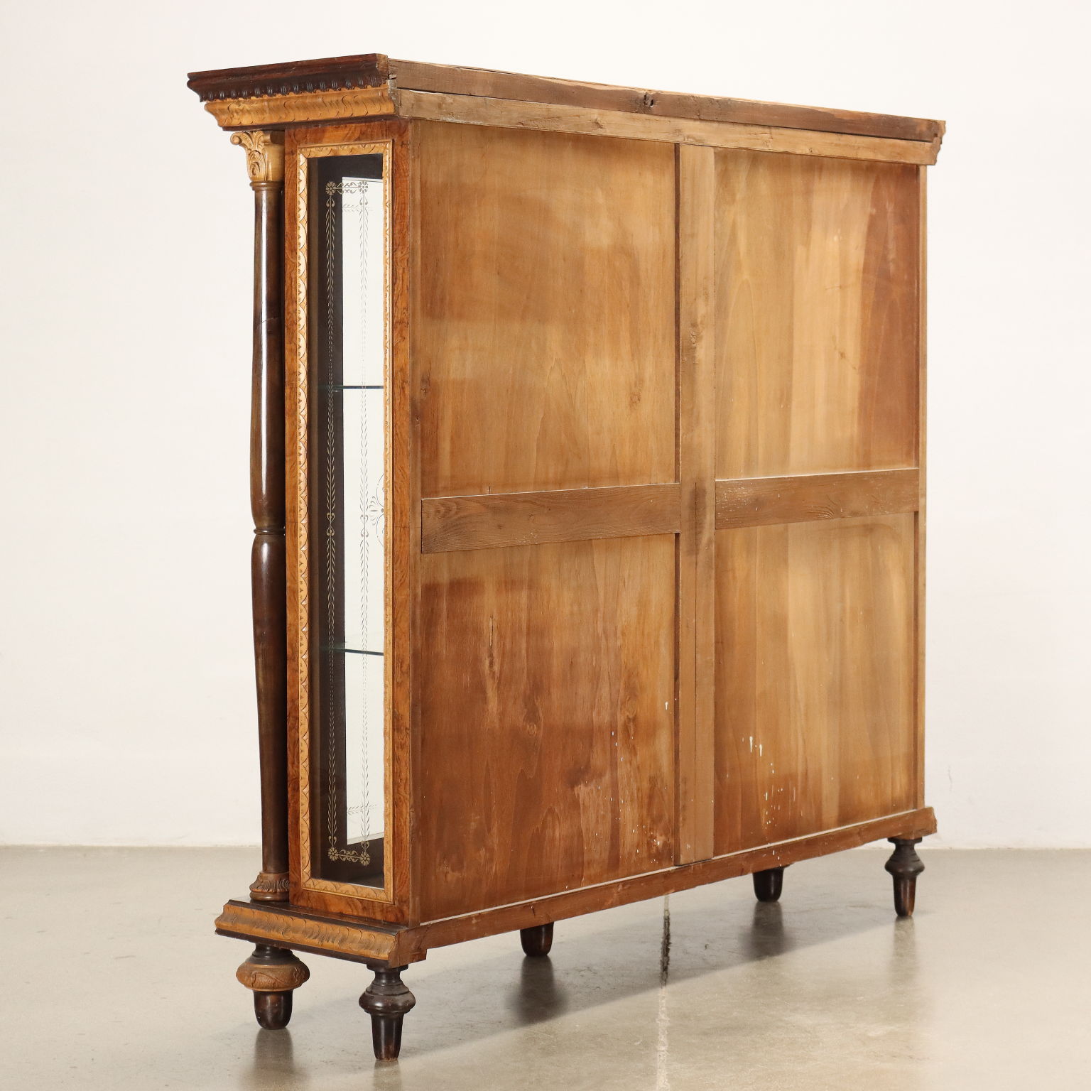 Doppia vetrina in stile impero in noce costituita da due ante sul fronte e fianchi a giorno con vetrine lavorate ad acido separate da colonne con capitelli di acero intagliato. Tutta la struttura è impiallacciata in radica di noce ed è riccamente intagliata su cornici e piedi.