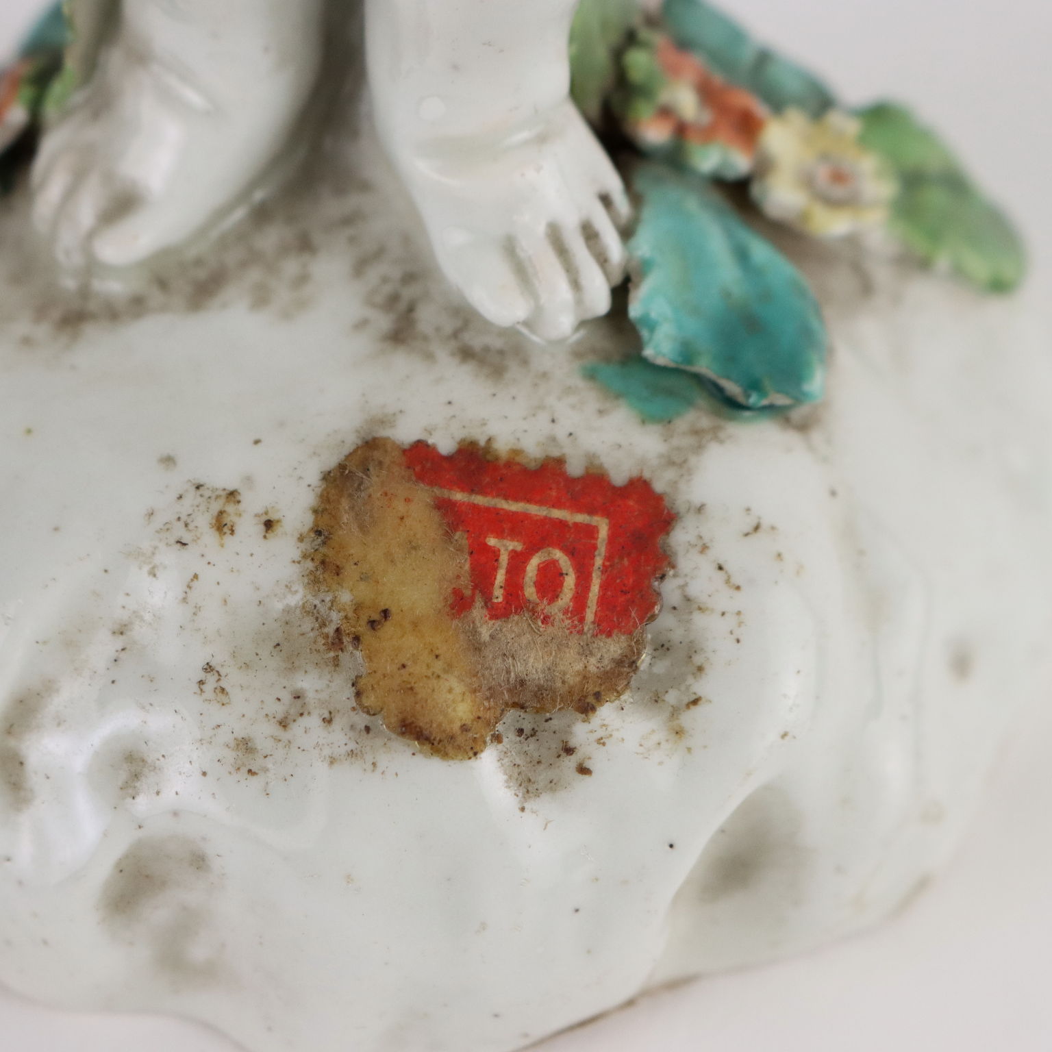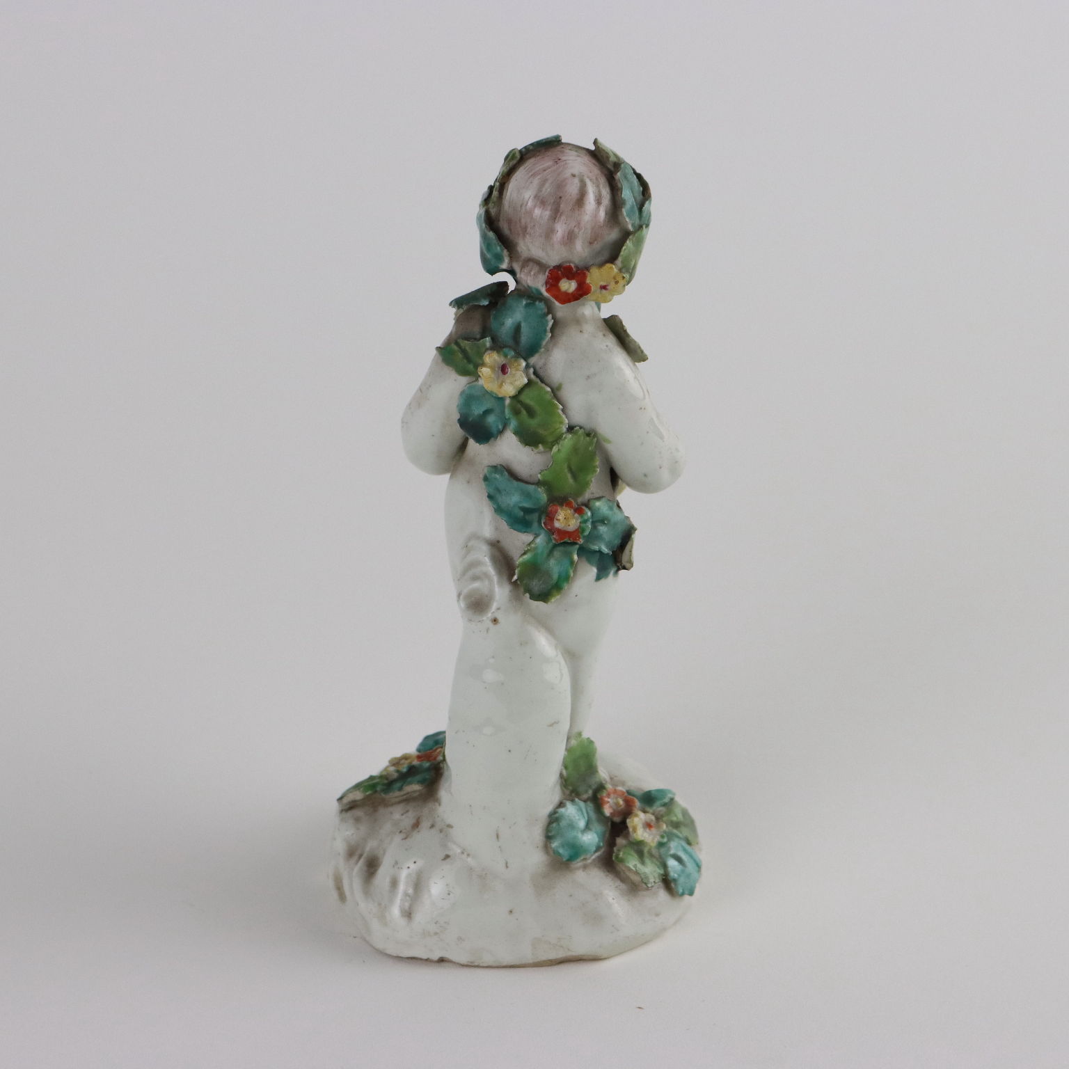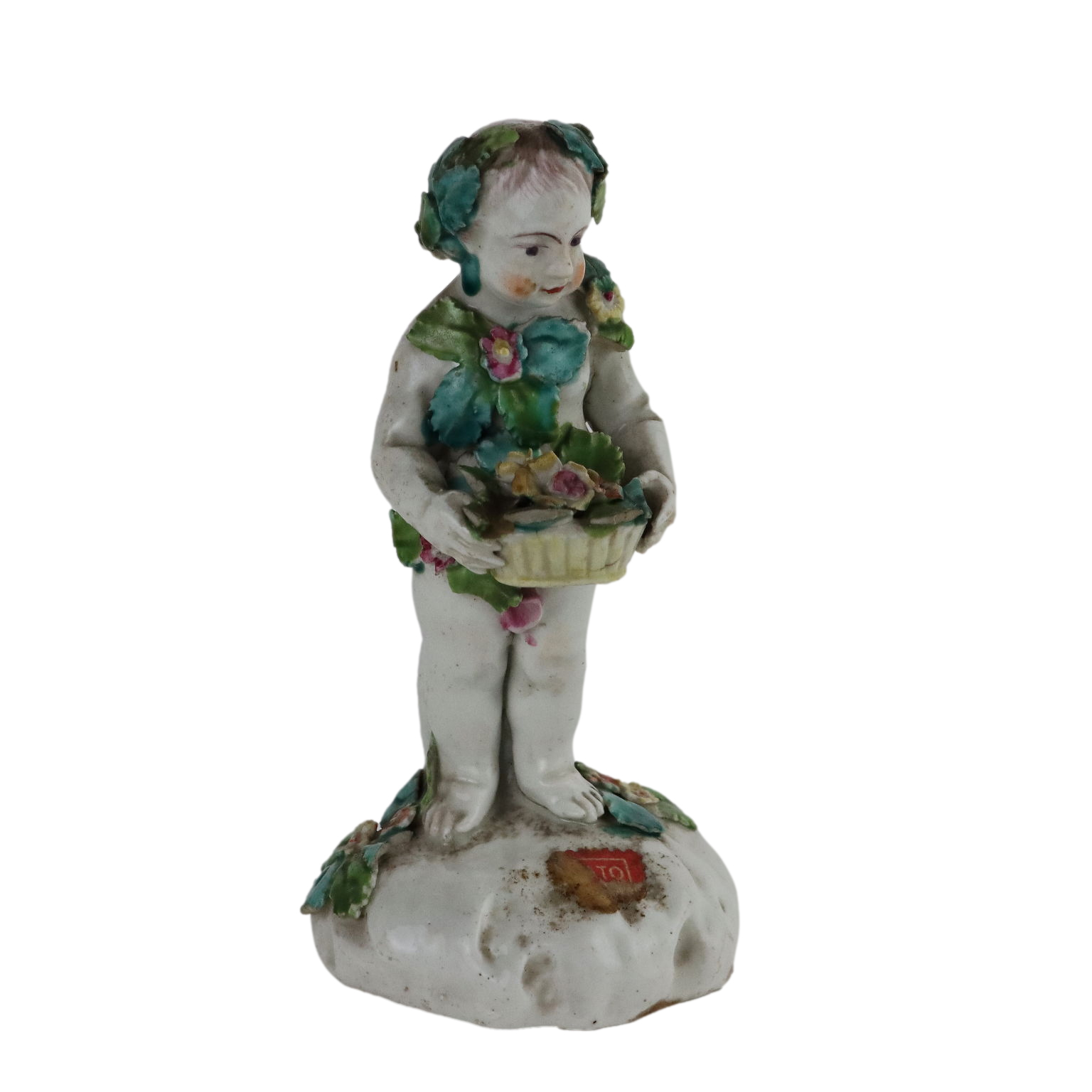 Statuina in porcellana bianca raffigurante fanciullo con decori a rilievo e cesto di fiori policromi.