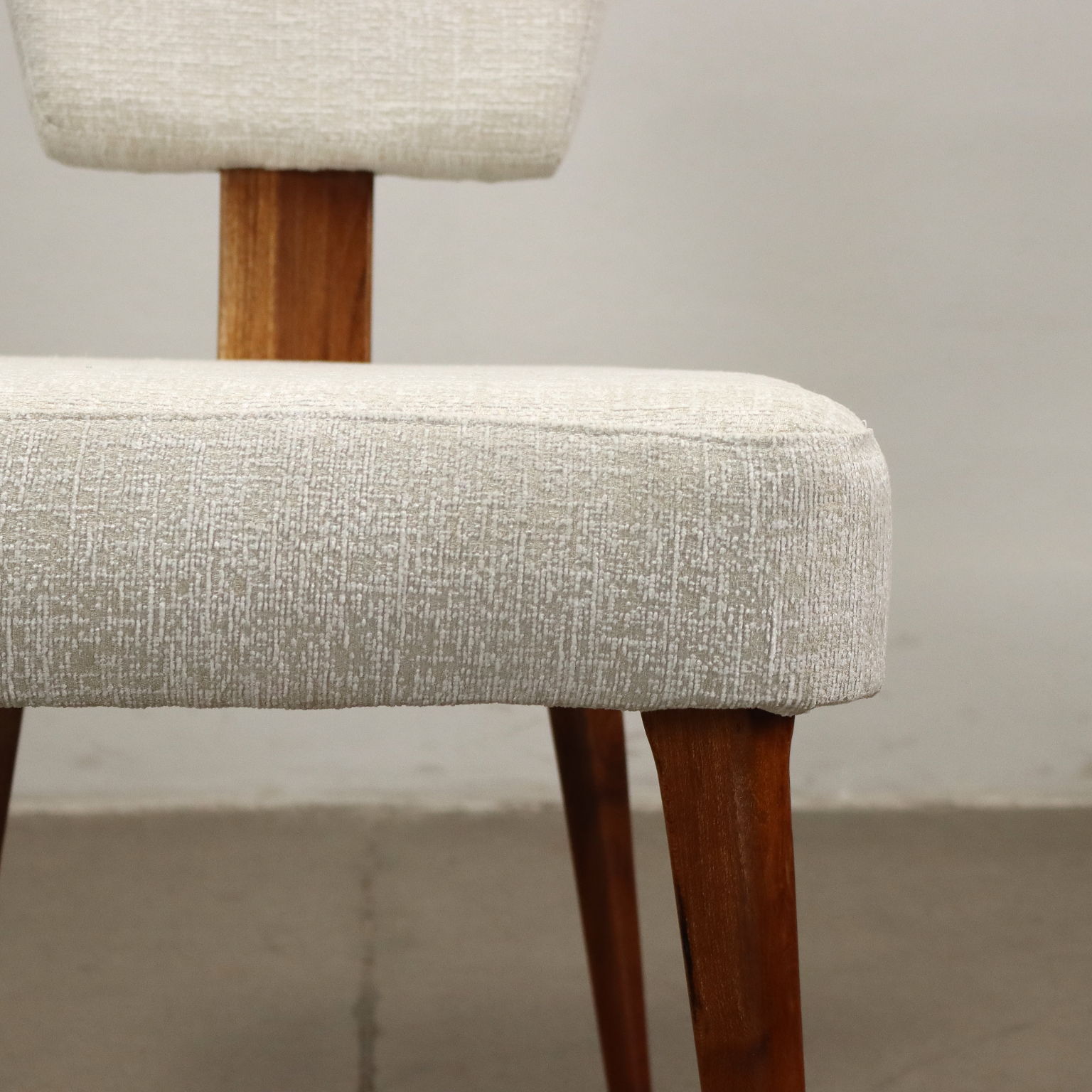 Gruppo di cinque sedie in legno di faggio con imbottitura in espanso e rivestimento in tessuto.