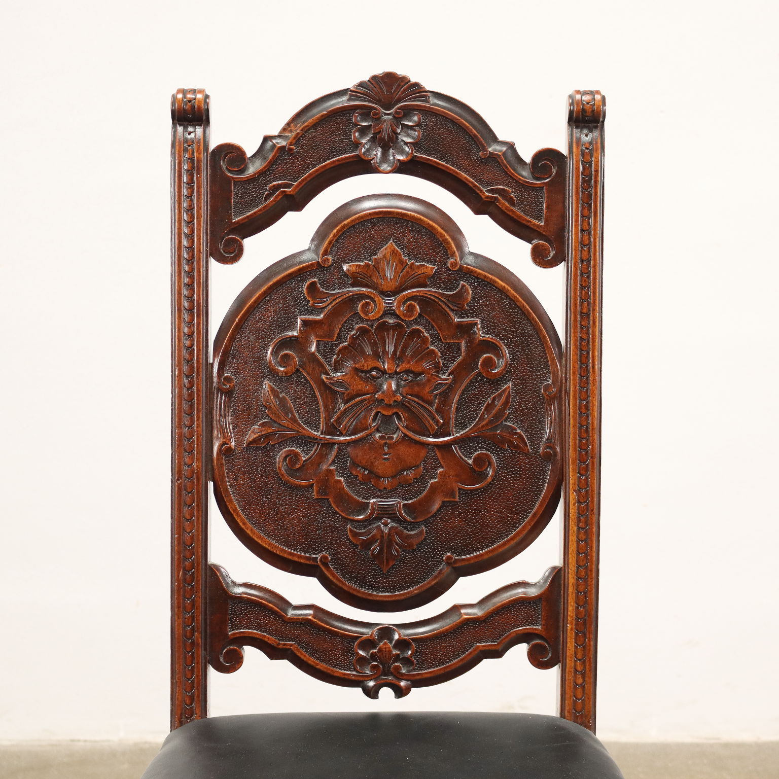 Gruppo di otto sedie in noce con mascherone intagliato su schienali e traverse di raccordo delle gambe. Seduta imbottita e rivestita in cuoio scurito.