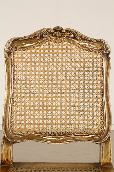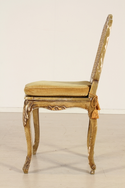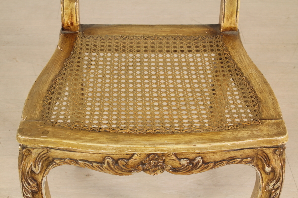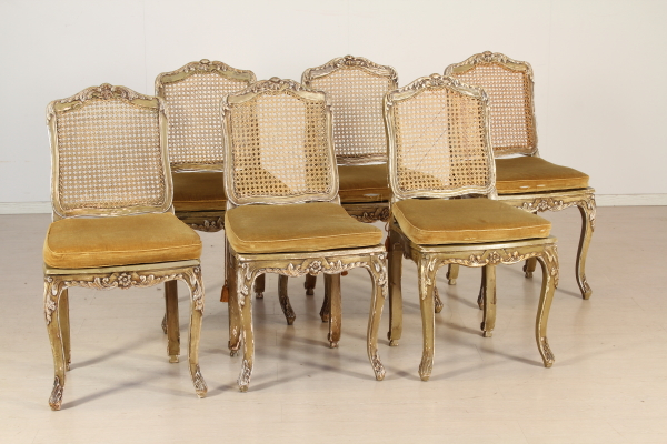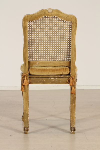 Sedie con gambe e fascia mossa e intagliate. Sedute e schienali in paglia di Vienna. Interamente laccate e decorate.