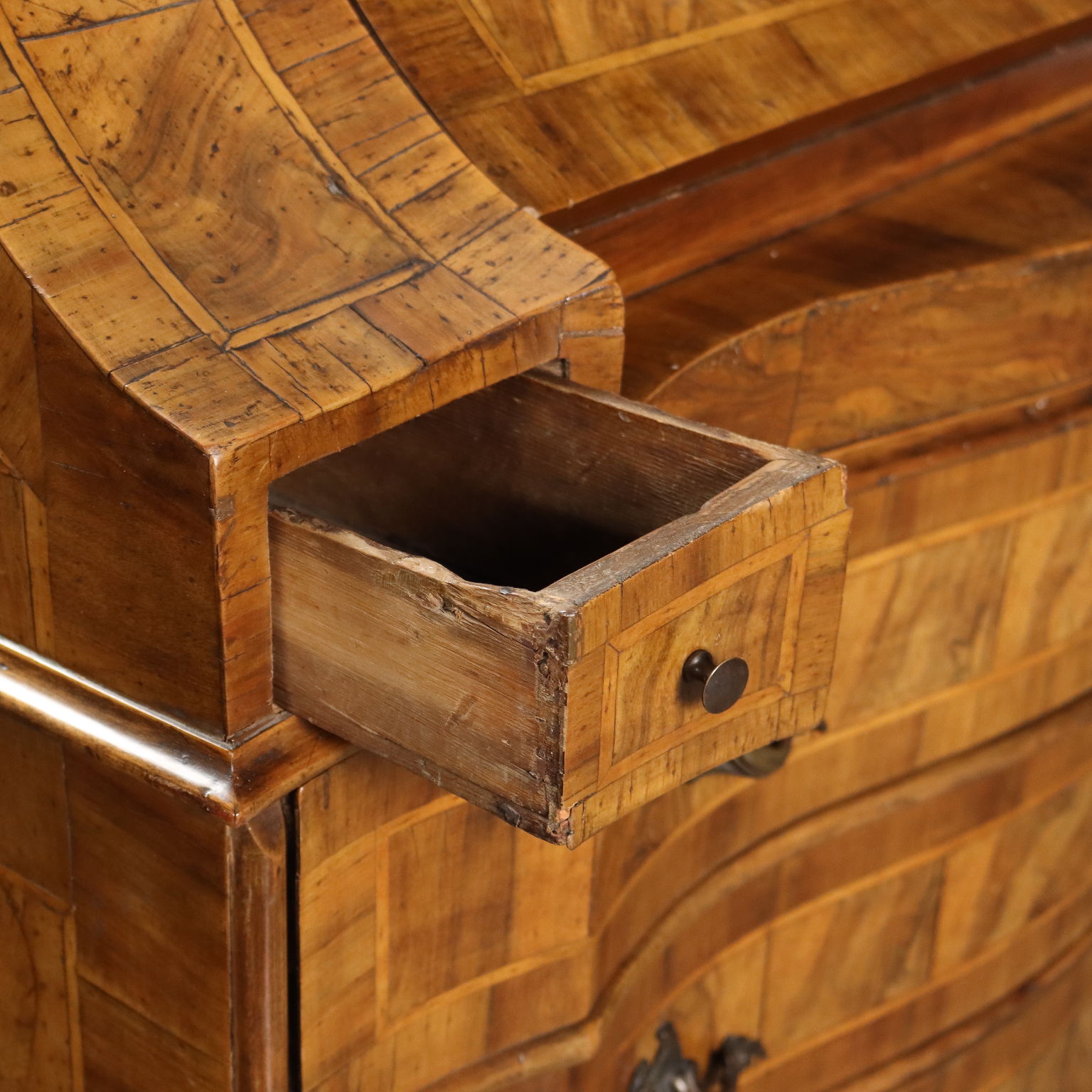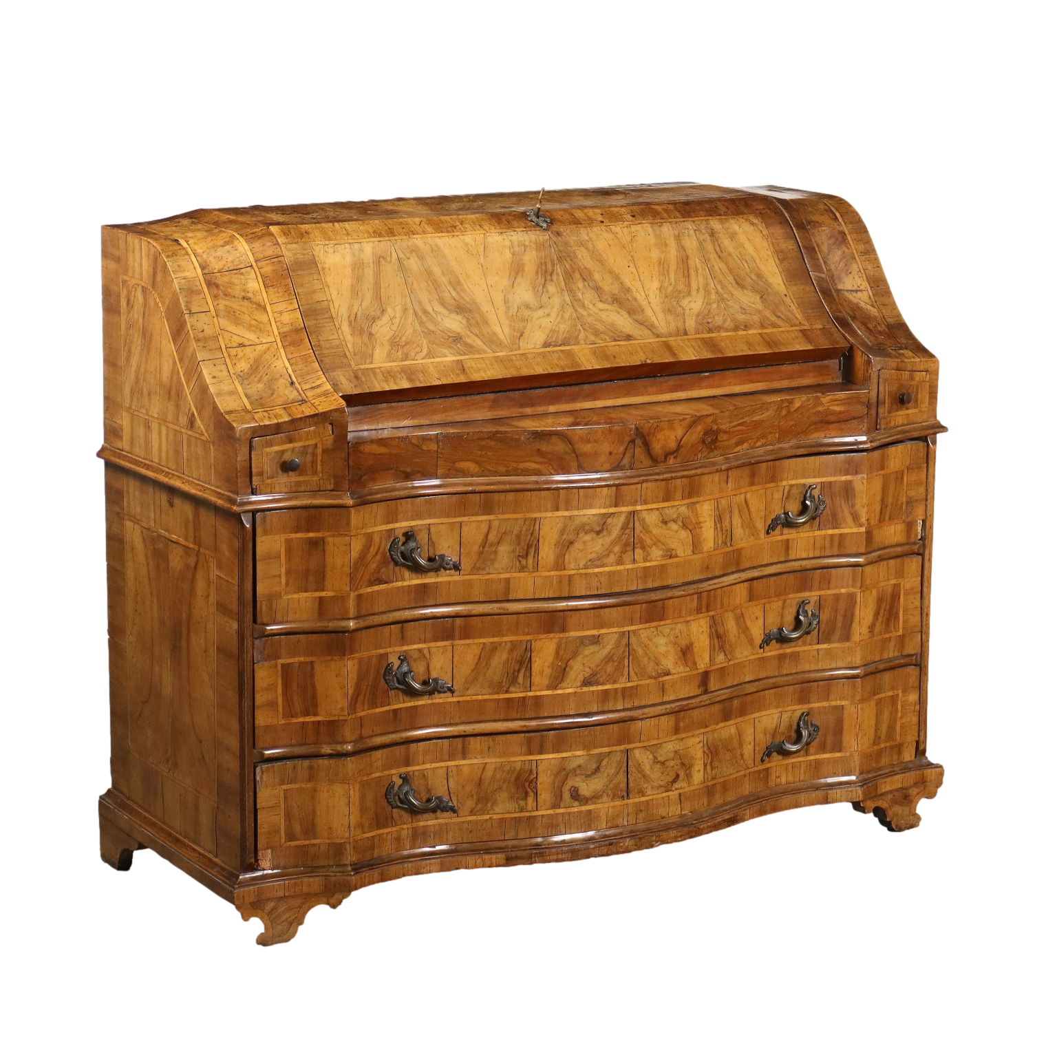 Ribalta completamente reimpiallacciata in radica di noce nel luglio del 1906, come indicato in un cassetto riportante la scritta da noi tradotta "Inteso L [...] Trane il sado in Luglio 1906". Piano filettato e leggermente rialzato, fronte mosso con anta a ribalta celante scarabattolo con sei cassettini, tre cassetti mossi sottostanti e due cassettini laterali. Impiallacciatura presente anche sui fianchi. Serrature non coeve.