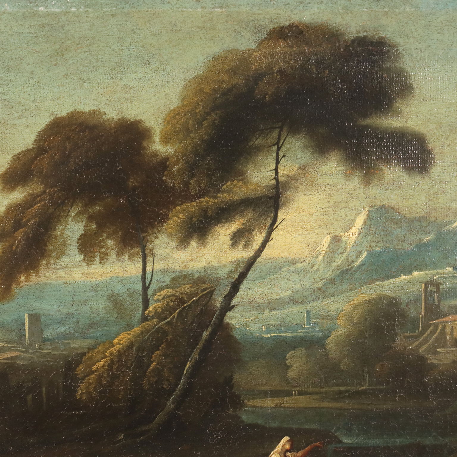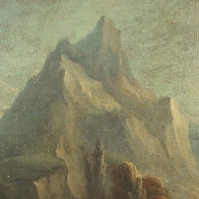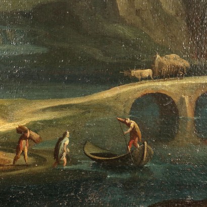 Olio su tela. Scuola romana del XVII secolo. I due paesaggi rimandano alla pittura romana del XVII per l'impostazione e lo stile pittorico: gli spazi ampi e dilatati, inquadrano in primo piano scorci di campagna bucolica, con corsi d'acqua ruscellanti, animati e popolati da figurine, e con strutture architettoniche alle spalle, in uno dei due quadri in particolare caratterizzate da una cupola barocca svettante sulle case; infine di sfondo e contorno, la natura che da spaziose vallate va a perdersi in pendii collinari in uno dei due, ma soprattutto in cime montuose sfumate nell' azzurro a confondersi con il cielo sovrastante. Spiccano i contrasti cromatici tra le tinte terrose utilizzate per la vegetazione e per le parti rocciose e le cromie più fredde dell'ampio squarcio di cielo che apre il paesaggio verso il profondo orizzonte. Restaurati e ritelati, i due dipinti sono presentati in cornici in stile.