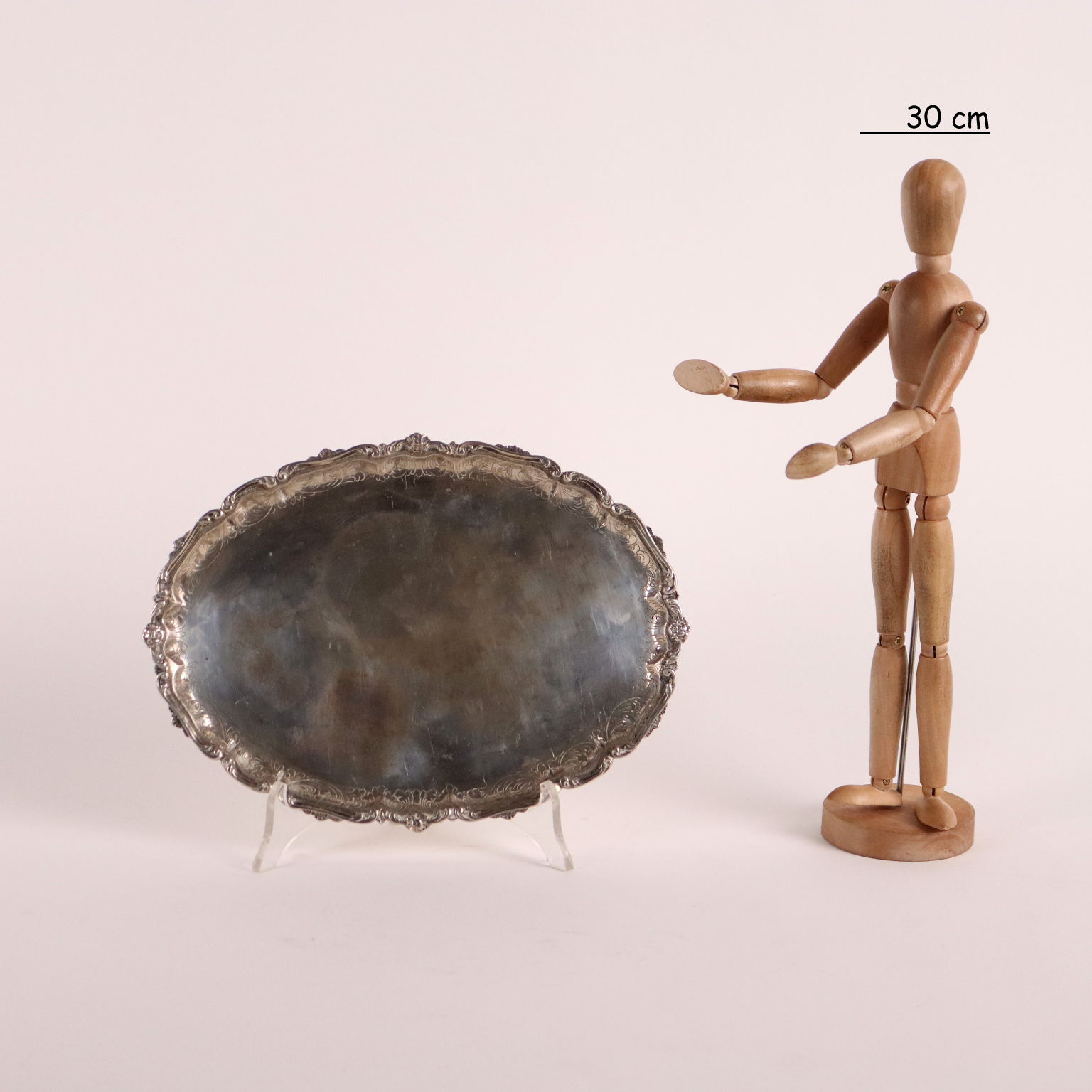 Vassoio in argento a fondo liscio con tesa decorata a volute fogliacee incise e bordo mosso lavorato a cesello. Marchio dell'argento e dell'argentiere incussi sotto la base. Grammi 292.
