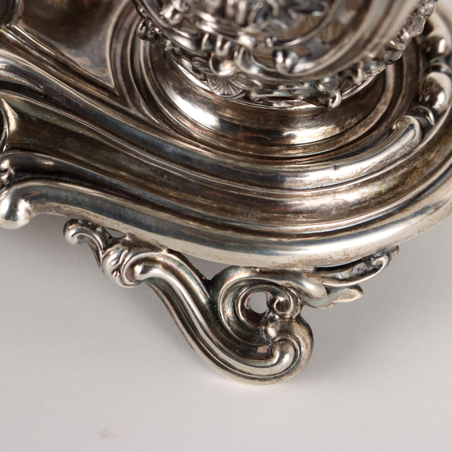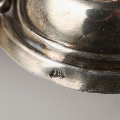 Oliera in argento sbalzato finemente lavorato a bulino con decori a volute e composizioni floreali. Marchio dell'argentiere incusso sul fronte della base ma poco decifrabile. Grammi 400.