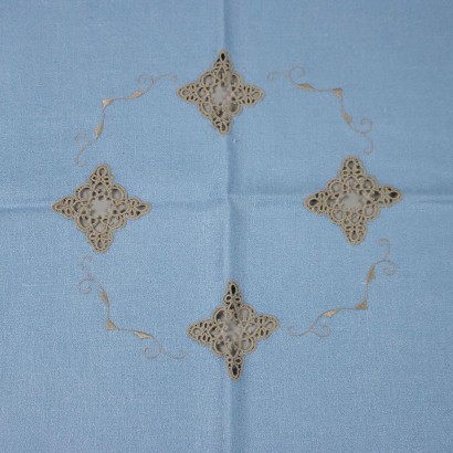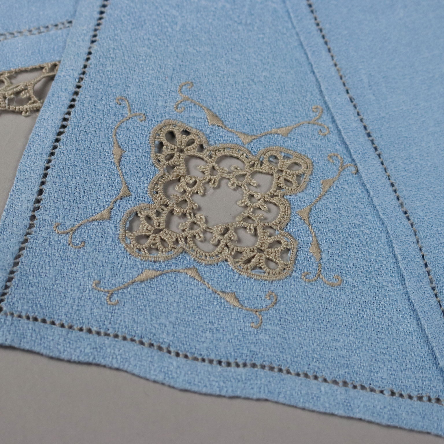 Tovaglietta da tè con otto tovaglioli Raffinata tovaglietta da tè in lino azzurro con inserti e bordura in chiacchierino colore ecrù Colore Azzurro Buone condizioni Composizione lino Dimensioni Tovaglietta cm 96 x cm 118 Tovaglioli cm 23 x cm 22