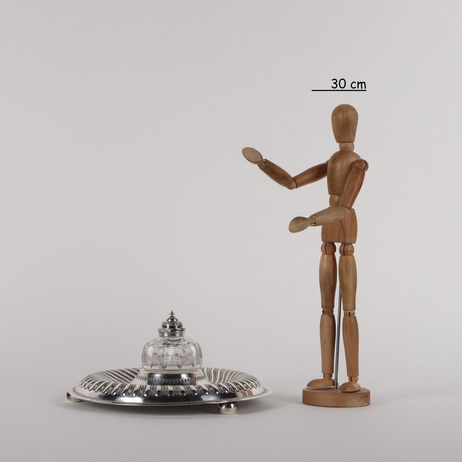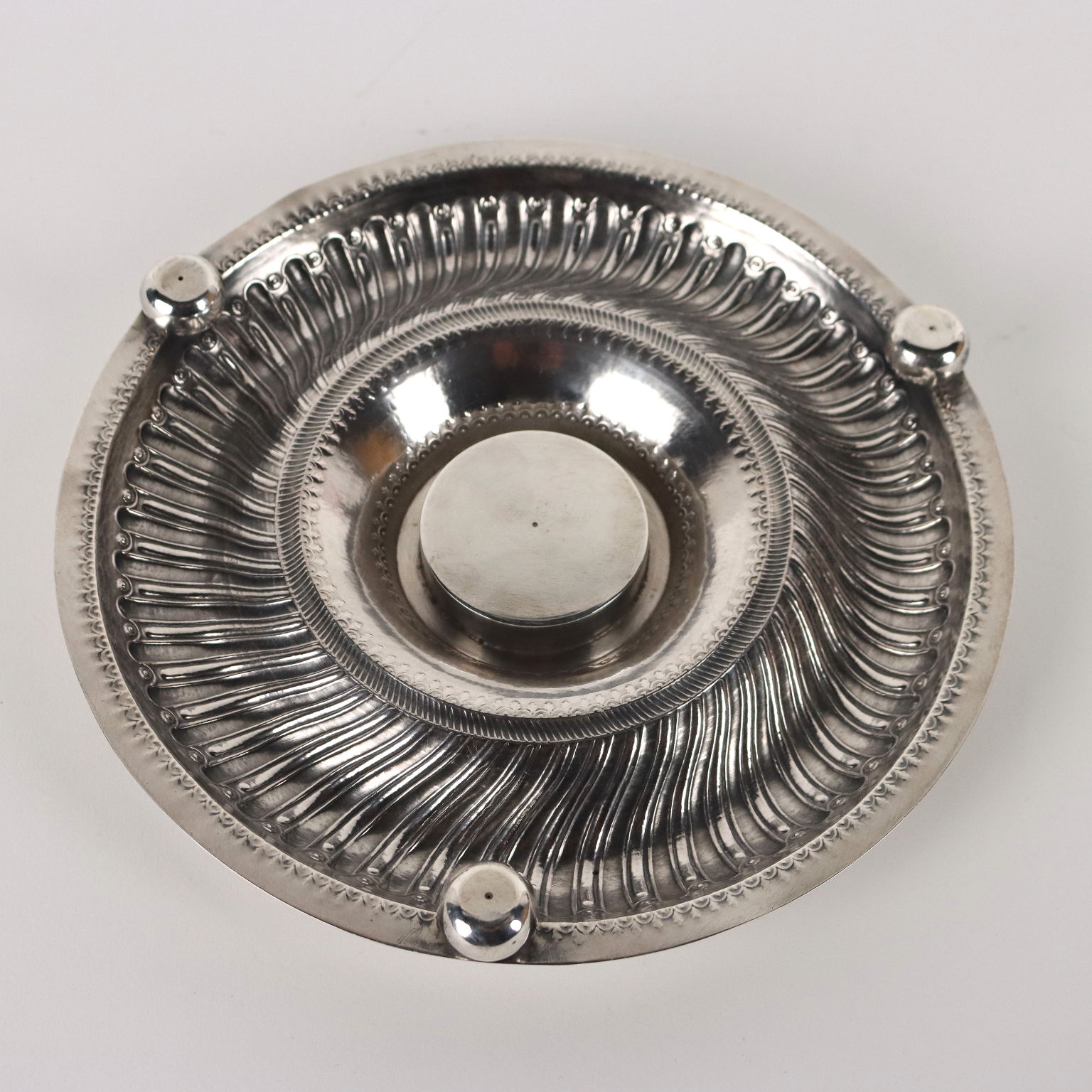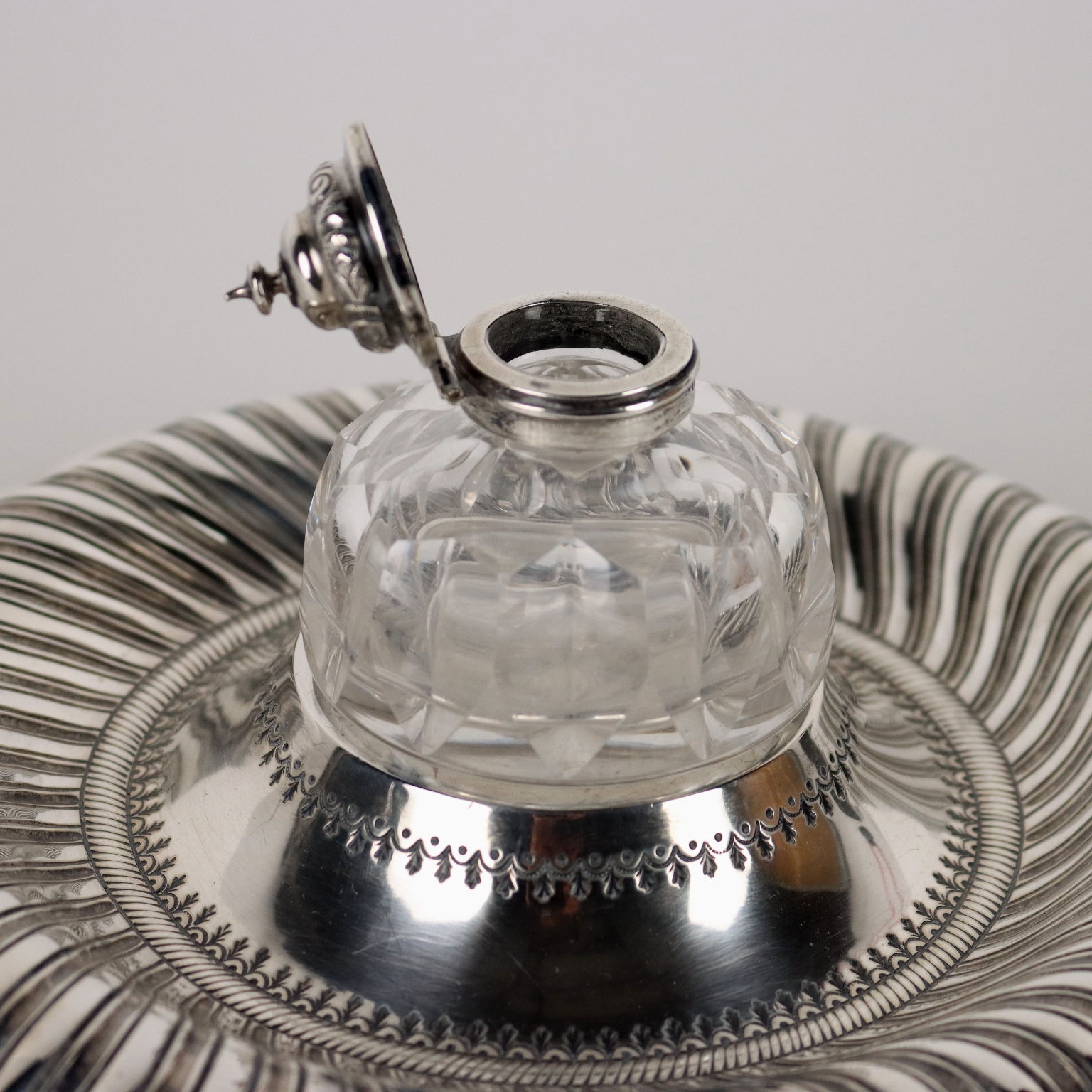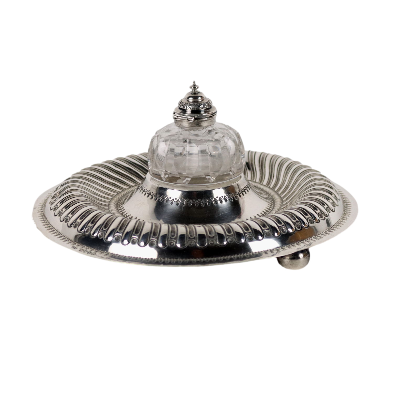 Calamaio in argento sbalzato e cesellato a forma circolare con baccellature. Al centro ampolla in vetro molato con coperchio in argento. Marchi dell'argento incussi sul bordo. Grammi 270.