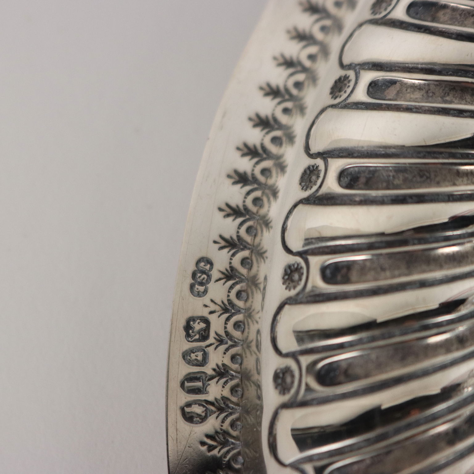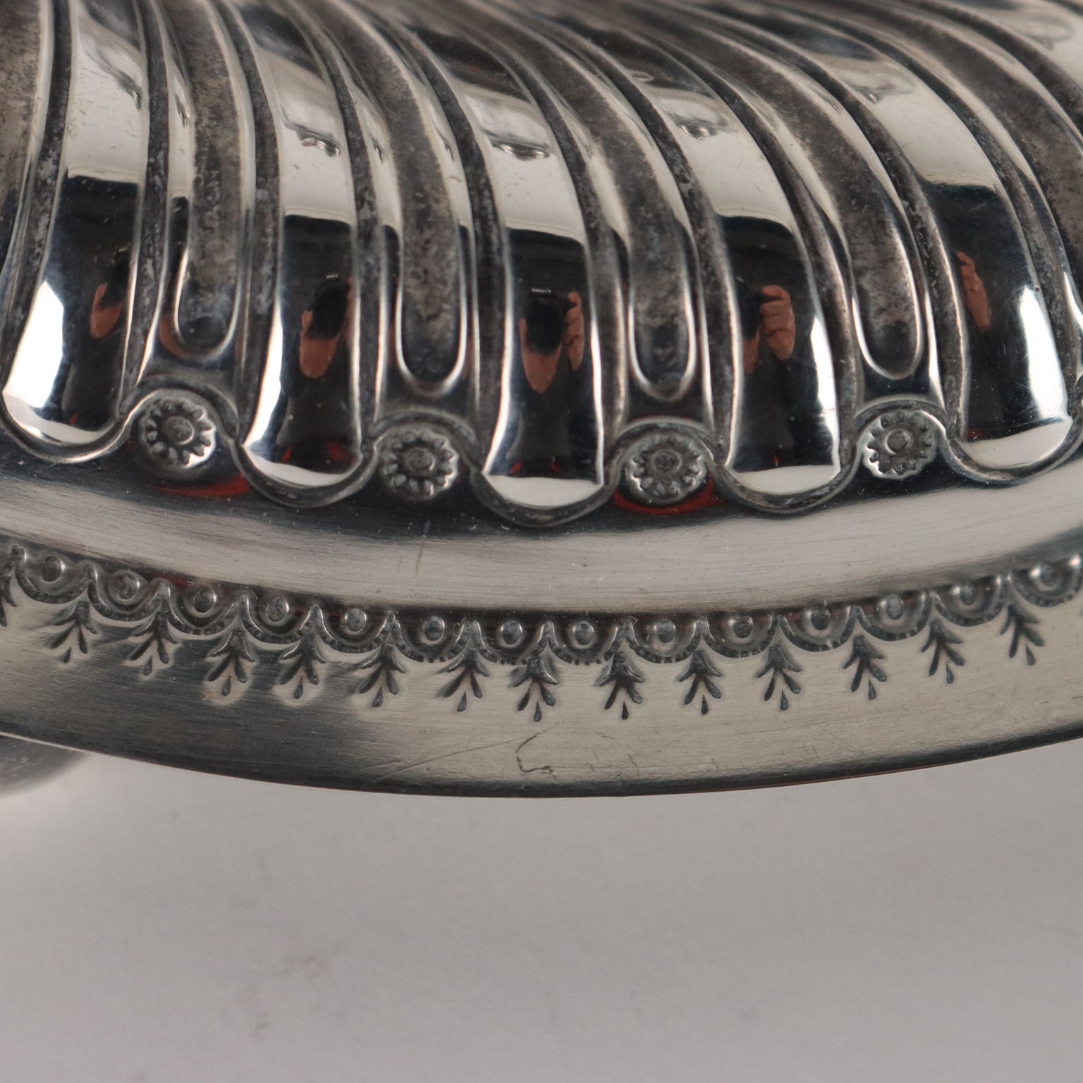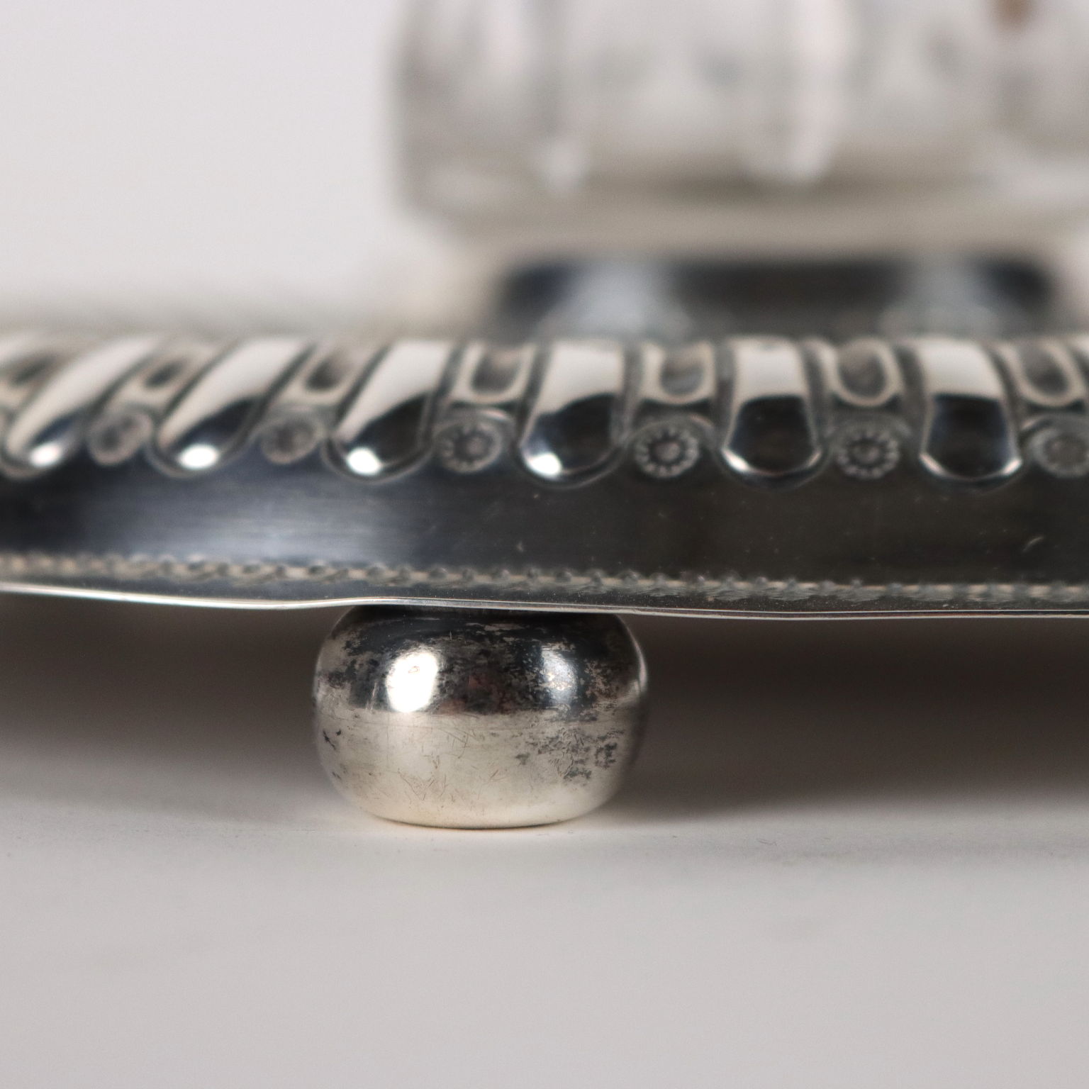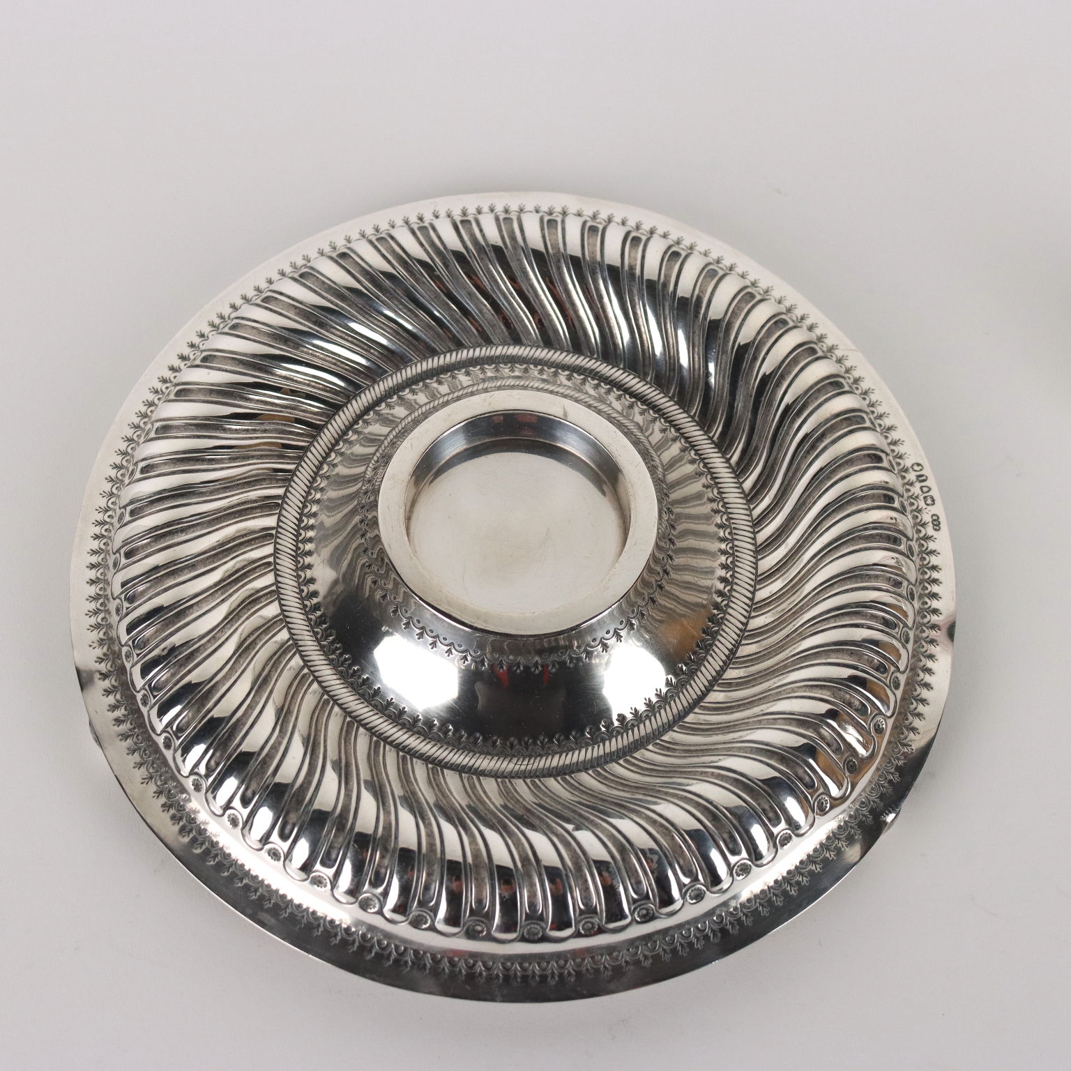 Calamaio in argento sbalzato e cesellato a forma circolare con baccellature. Al centro ampolla in vetro molato con coperchio in argento. Marchi dell'argento incussi sul bordo. Grammi 270.