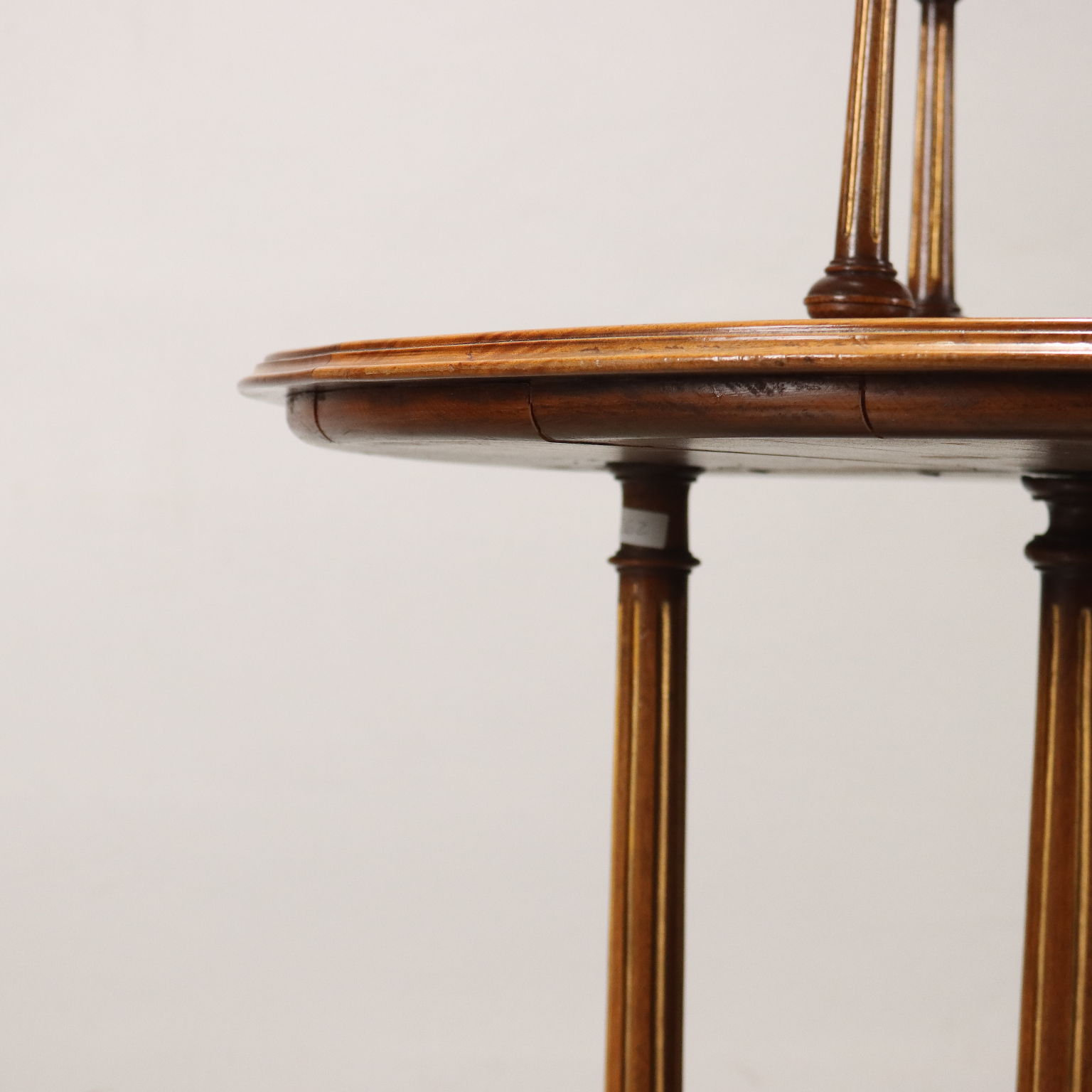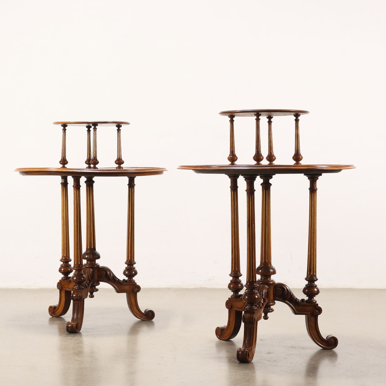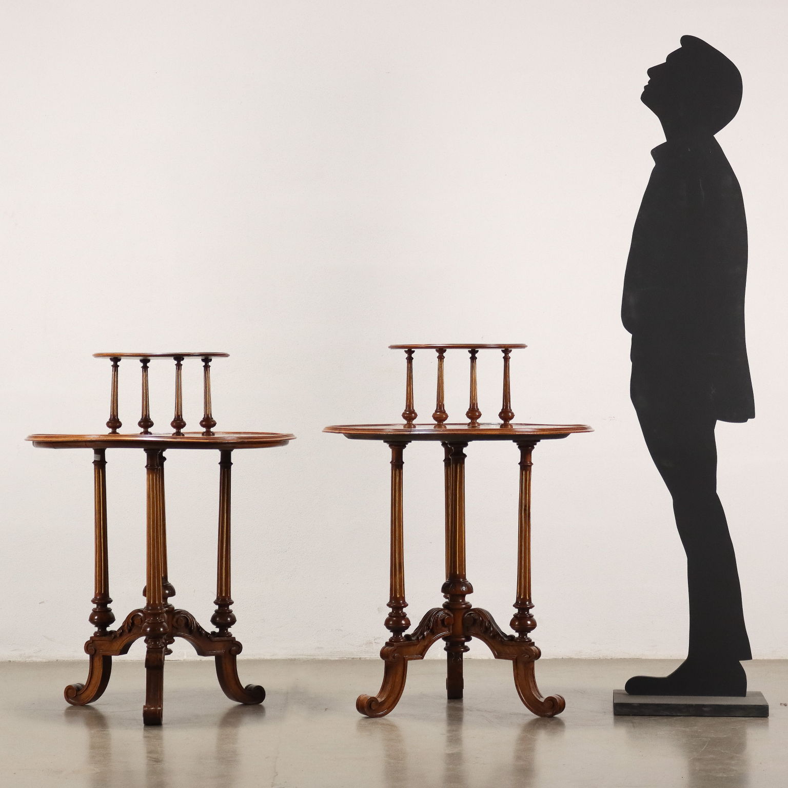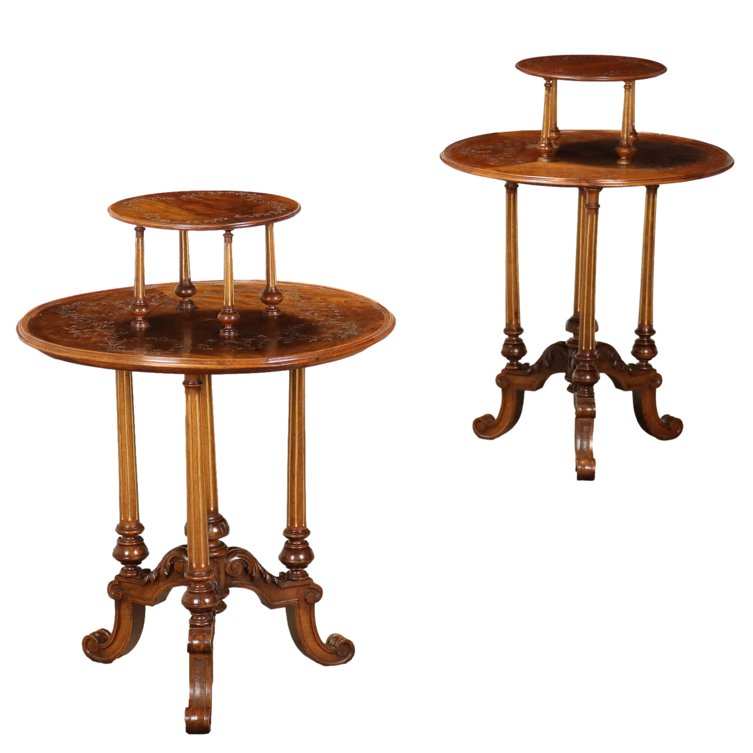 Coppia di servomuto in mogano. Piano e pianetto d'appoggio riccamente intagliati con motivi fitomorfi, collegati da colonnine d'appoggio con sgorbiature dorate che riprendono la forma delle quattro gambe raccordate da traversa di legno riccamente intagliata con motivi fogliacei. Piedini mossi. Restauri. Italia XX secolo.