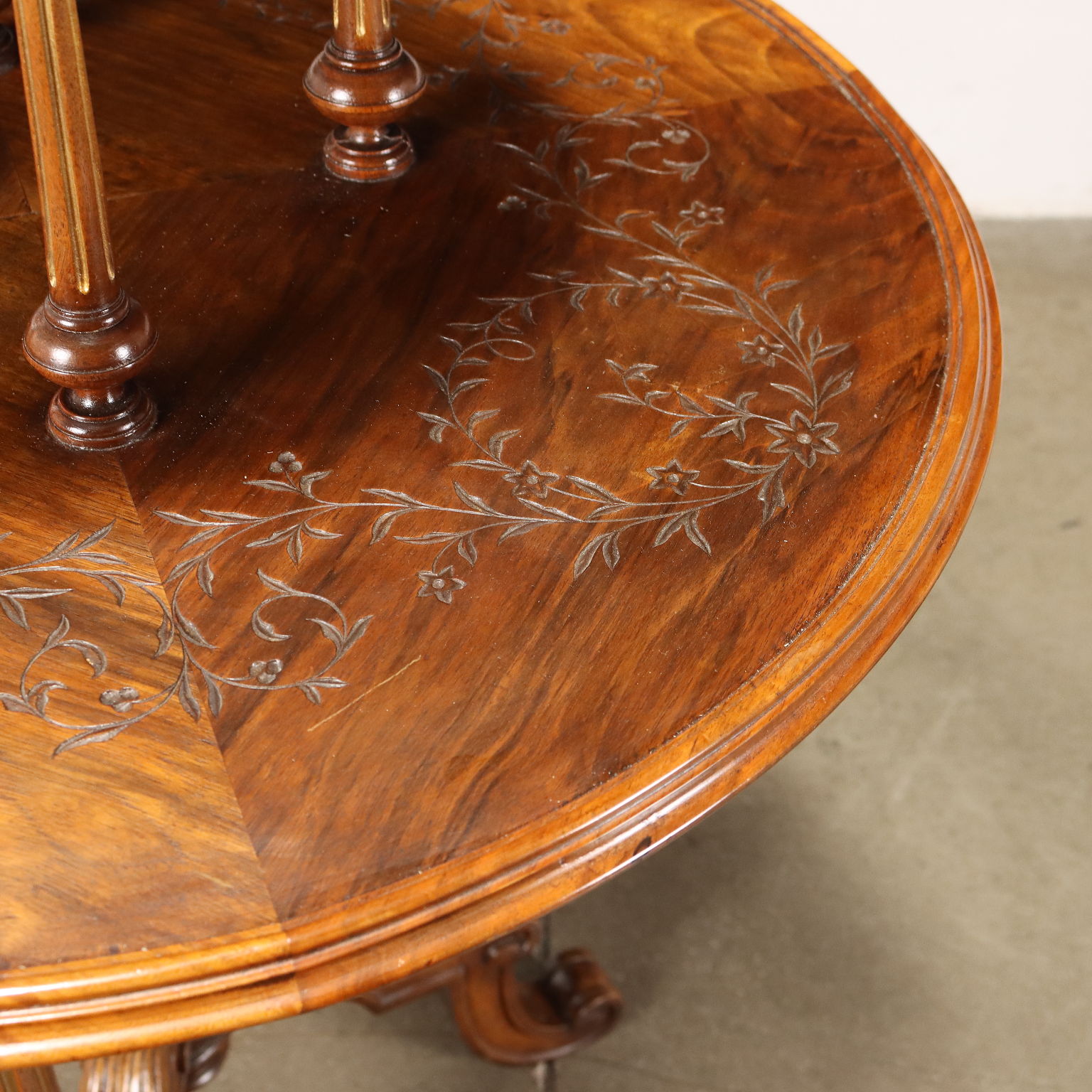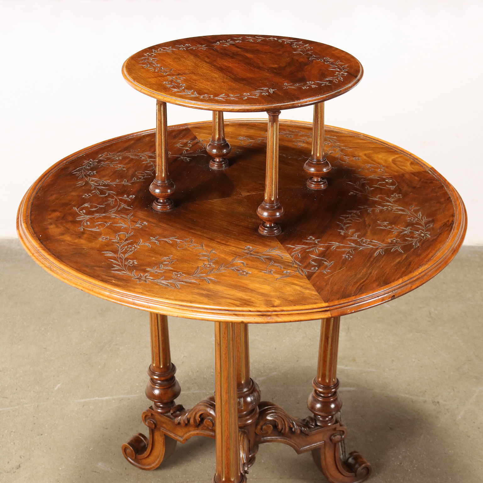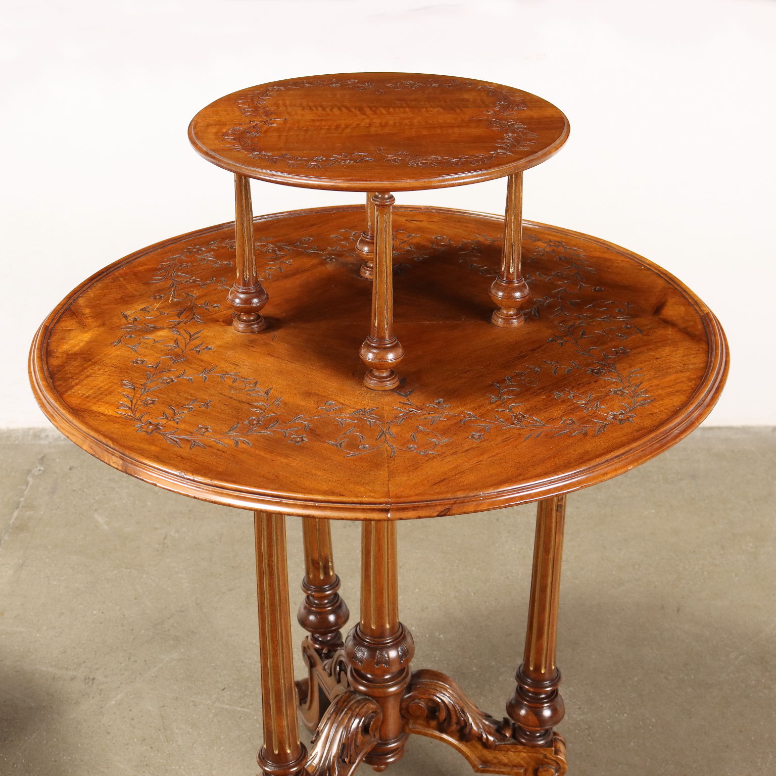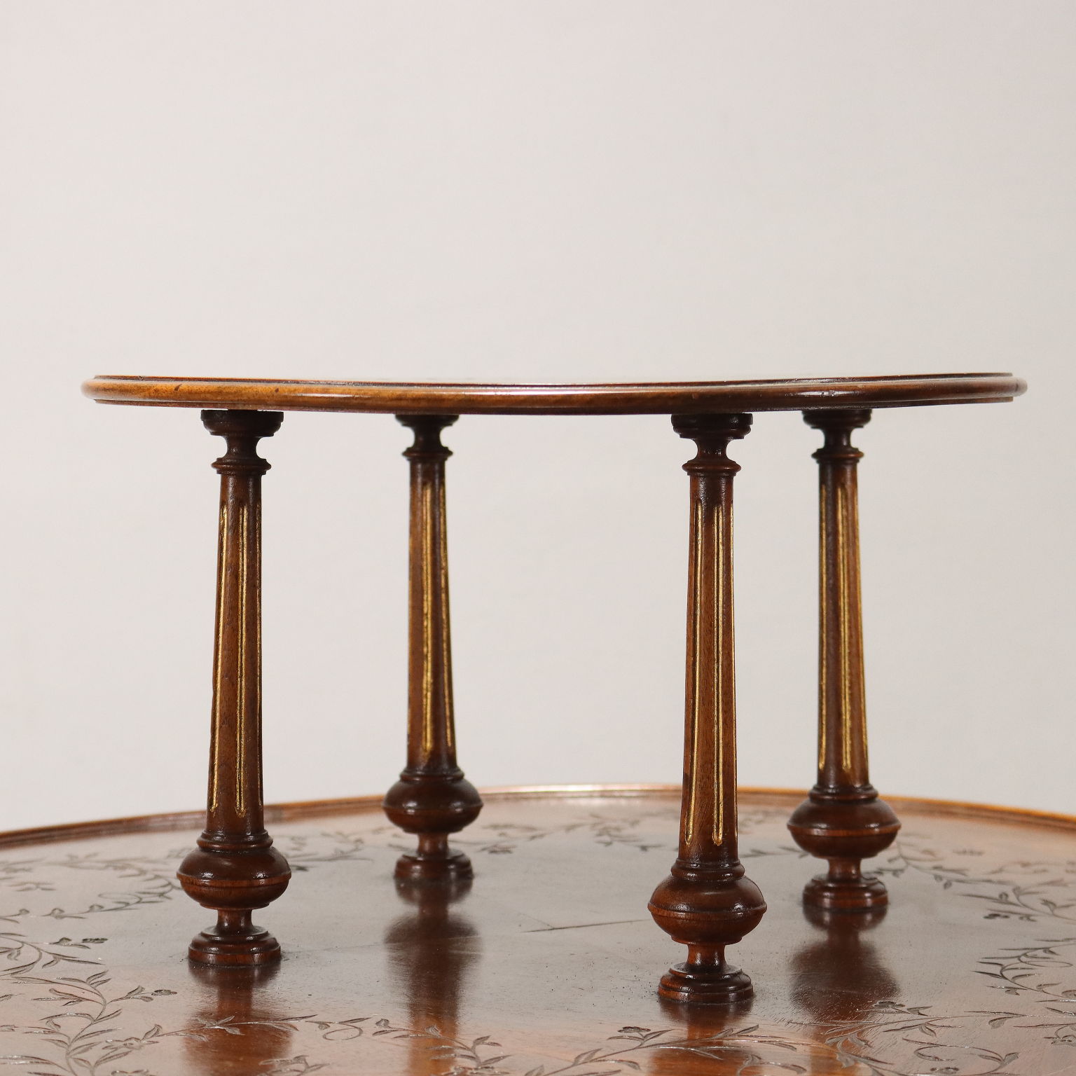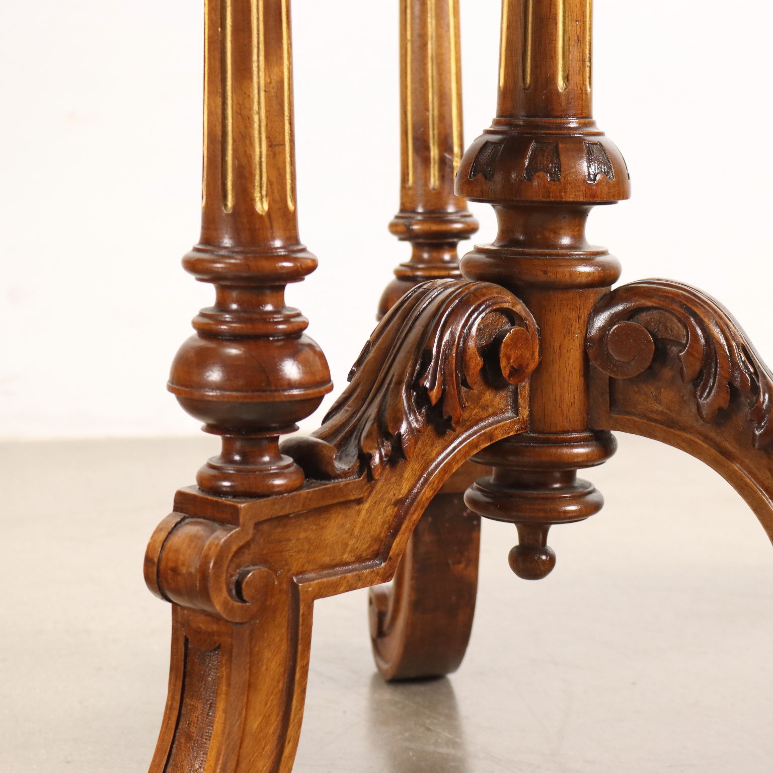 Coppia di servomuto in mogano. Piano e pianetto d'appoggio riccamente intagliati con motivi fitomorfi, collegati da colonnine d'appoggio con sgorbiature dorate che riprendono la forma delle quattro gambe raccordate da traversa di legno riccamente intagliata con motivi fogliacei. Piedini mossi. Restauri. Italia XX secolo.