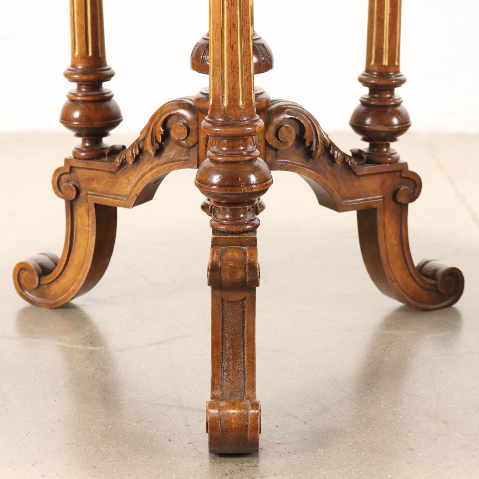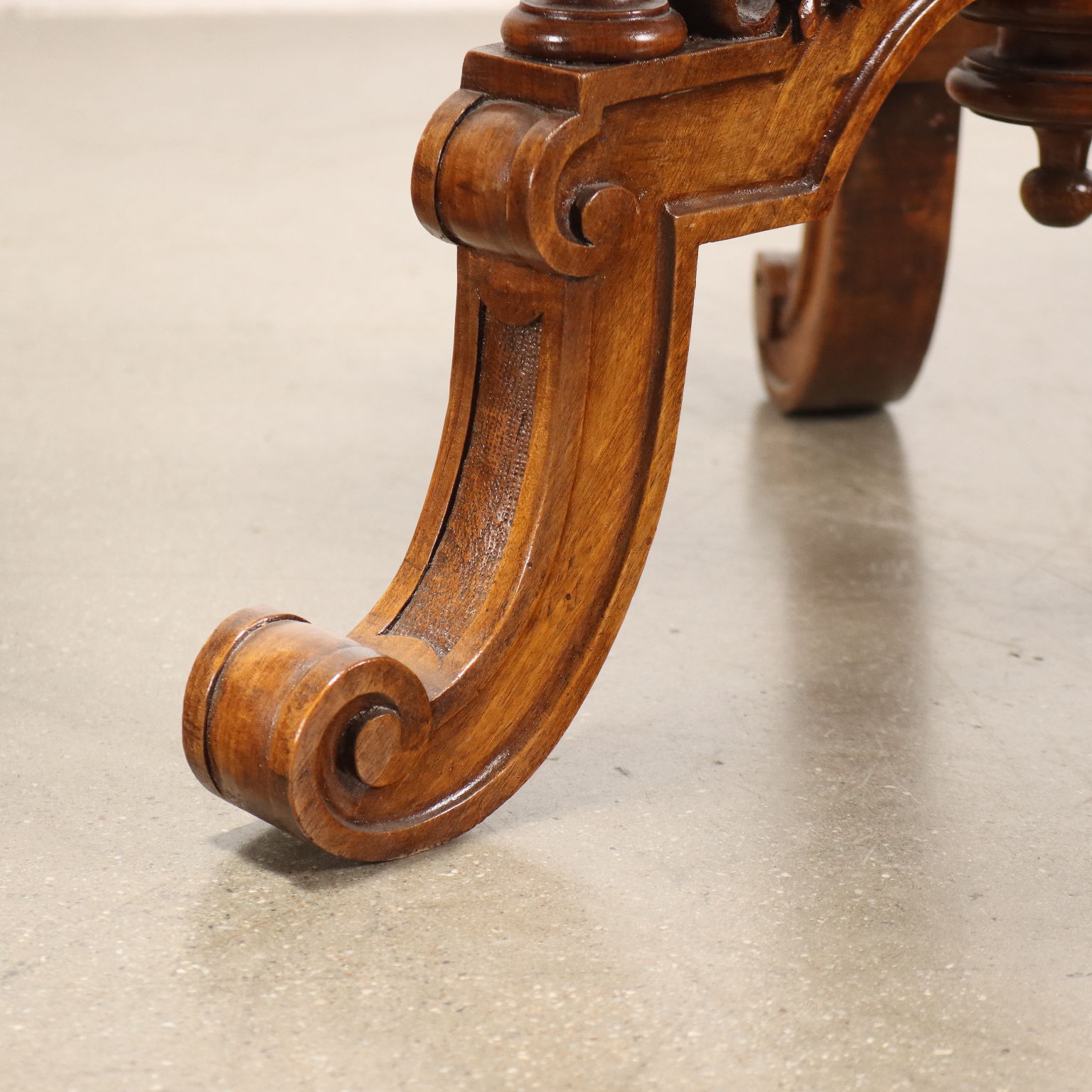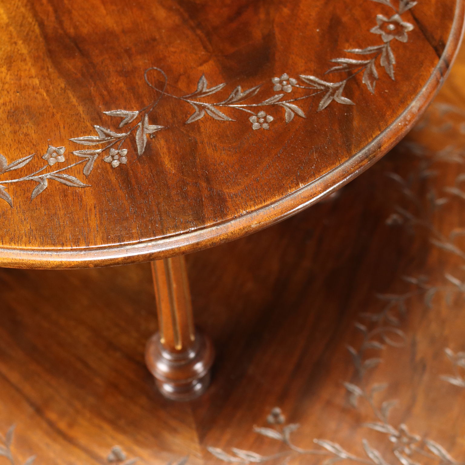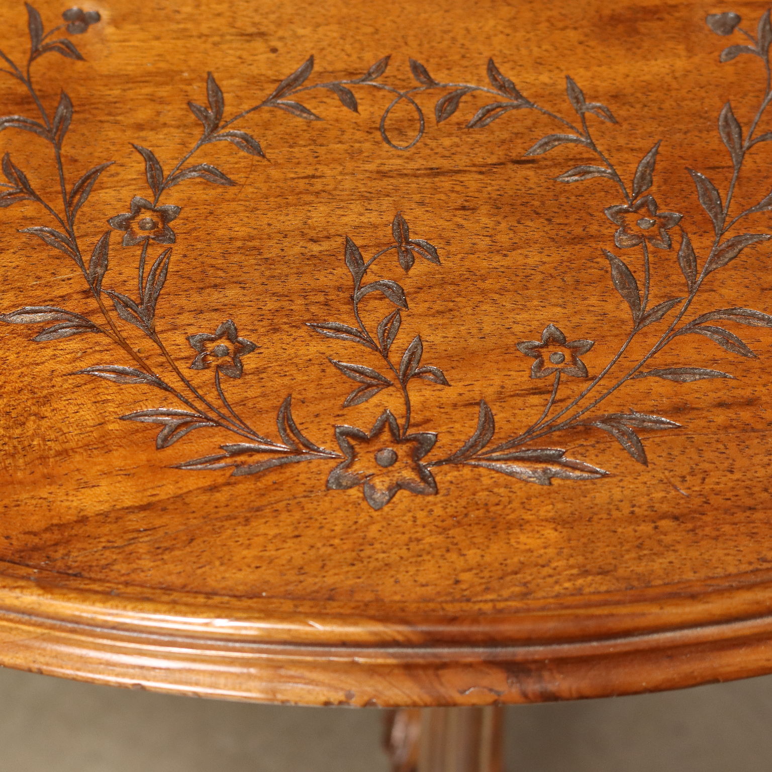 Coppia di servomuto in mogano. Piano e pianetto d'appoggio riccamente intagliati con motivi fitomorfi, collegati da colonnine d'appoggio con sgorbiature dorate che riprendono la forma delle quattro gambe raccordate da traversa di legno riccamente intagliata con motivi fogliacei. Piedini mossi. Restauri. Italia XX secolo.