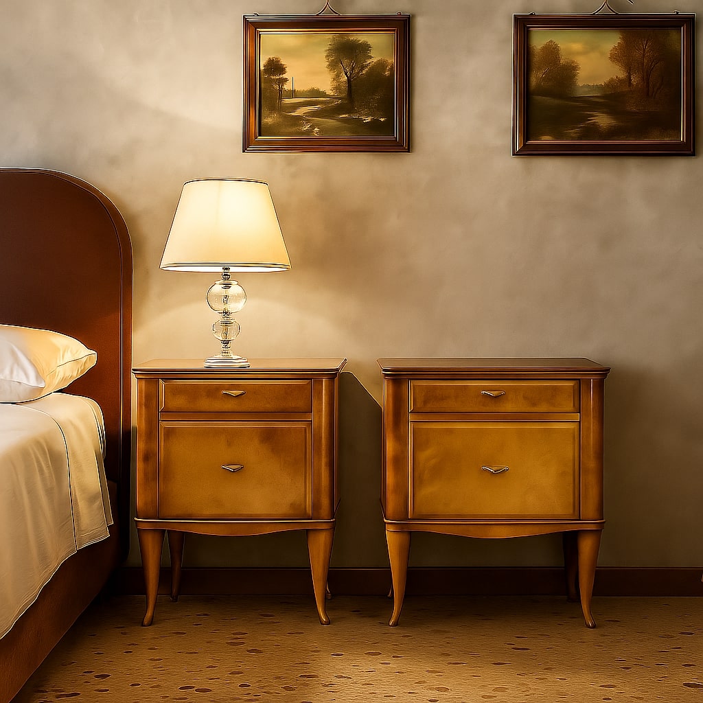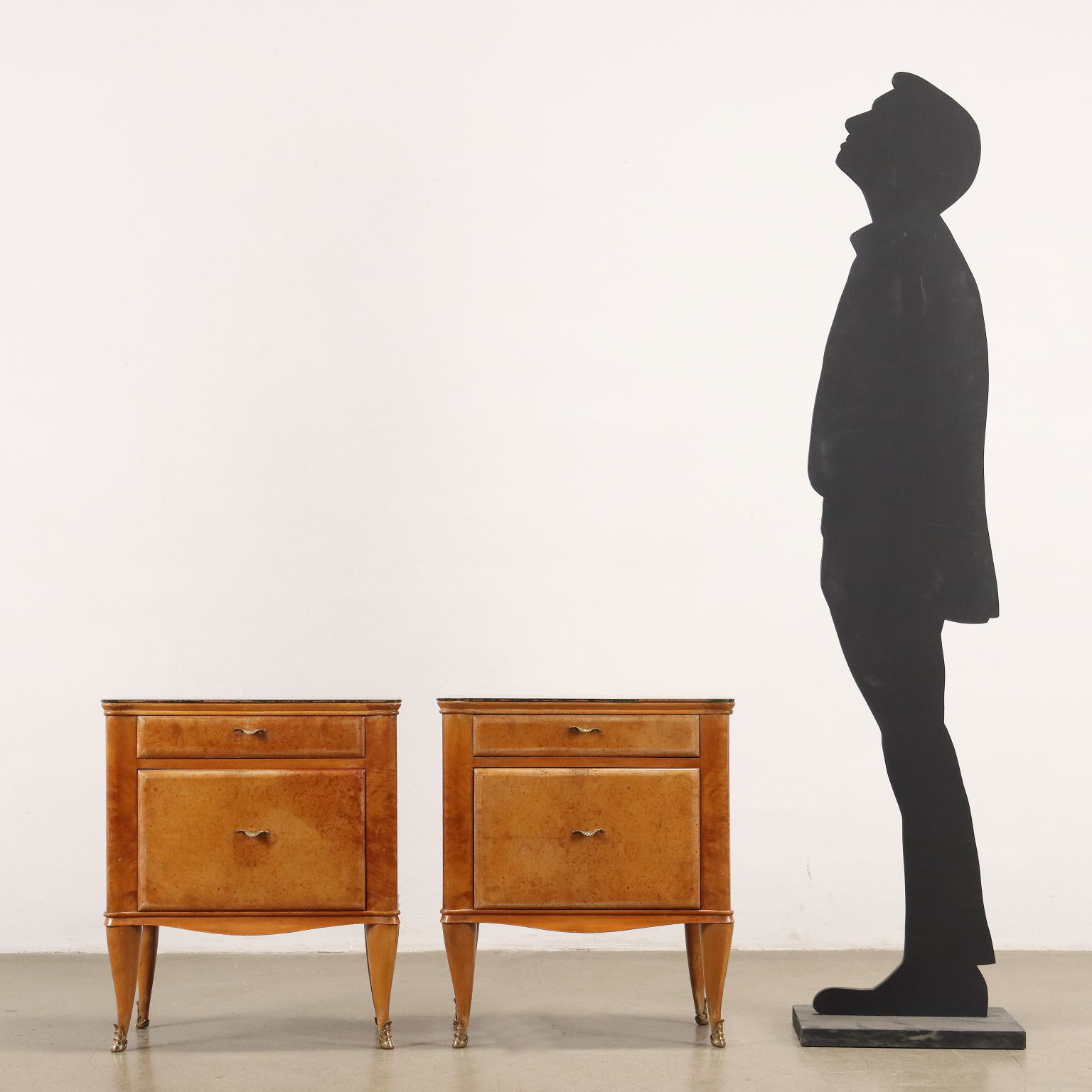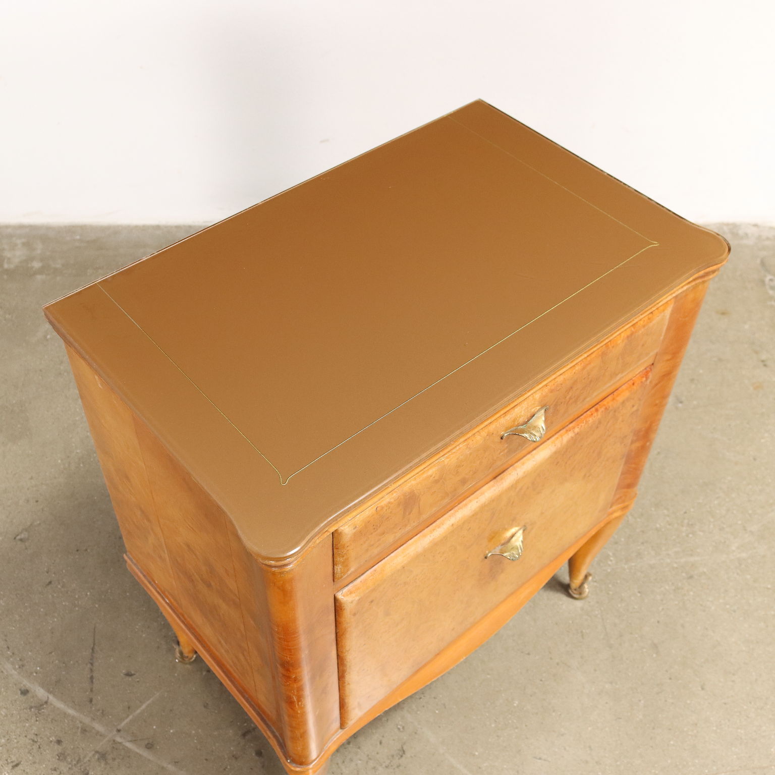 Coppia di comodini con anta battente e cassetto in legno impiallacciato radica con particolari in ottone e piano in vetro retro trattato.