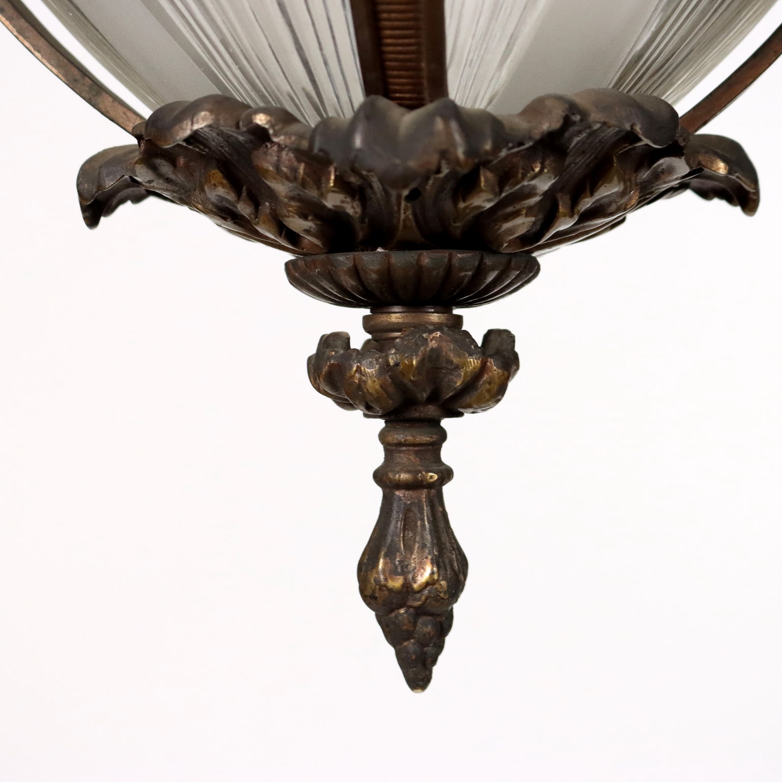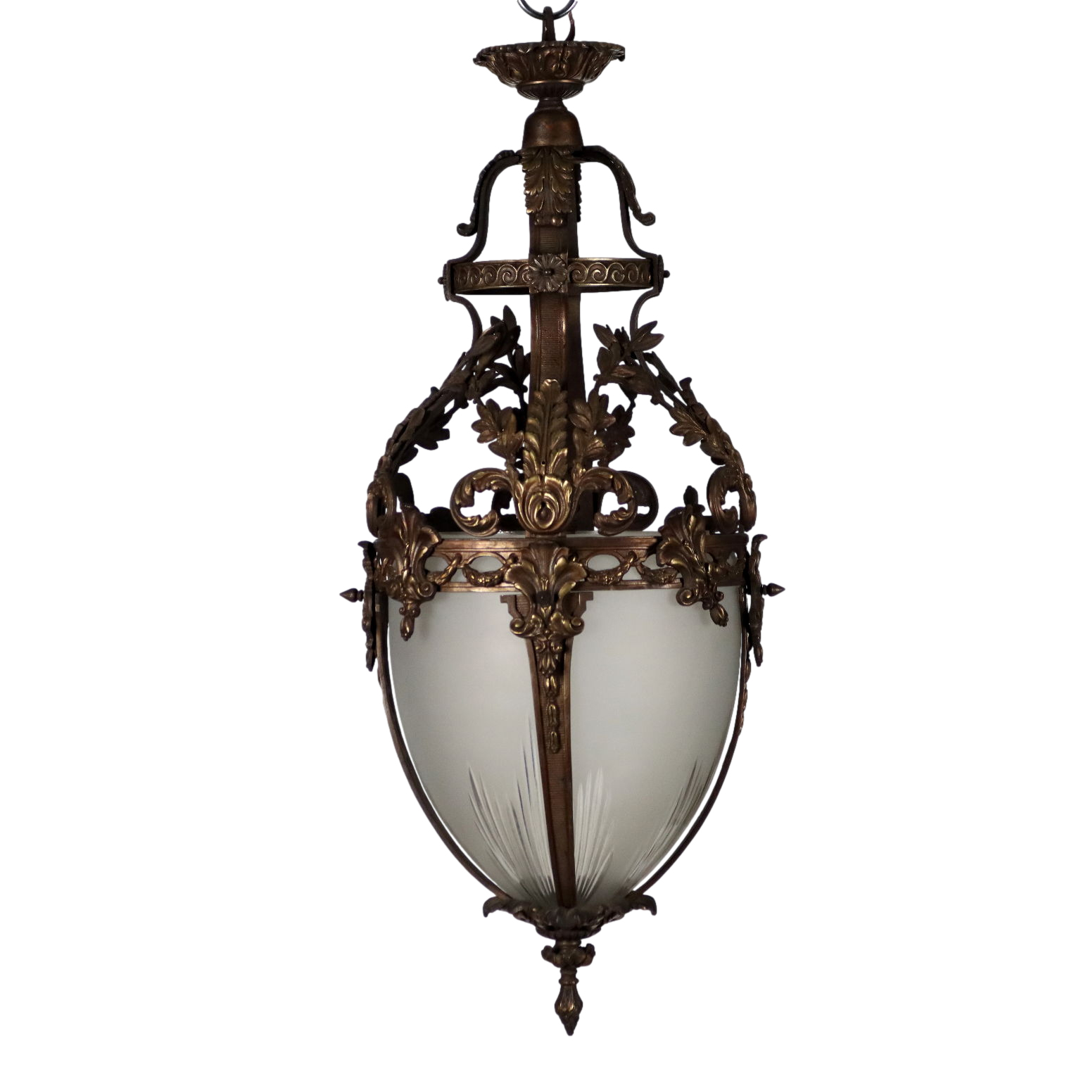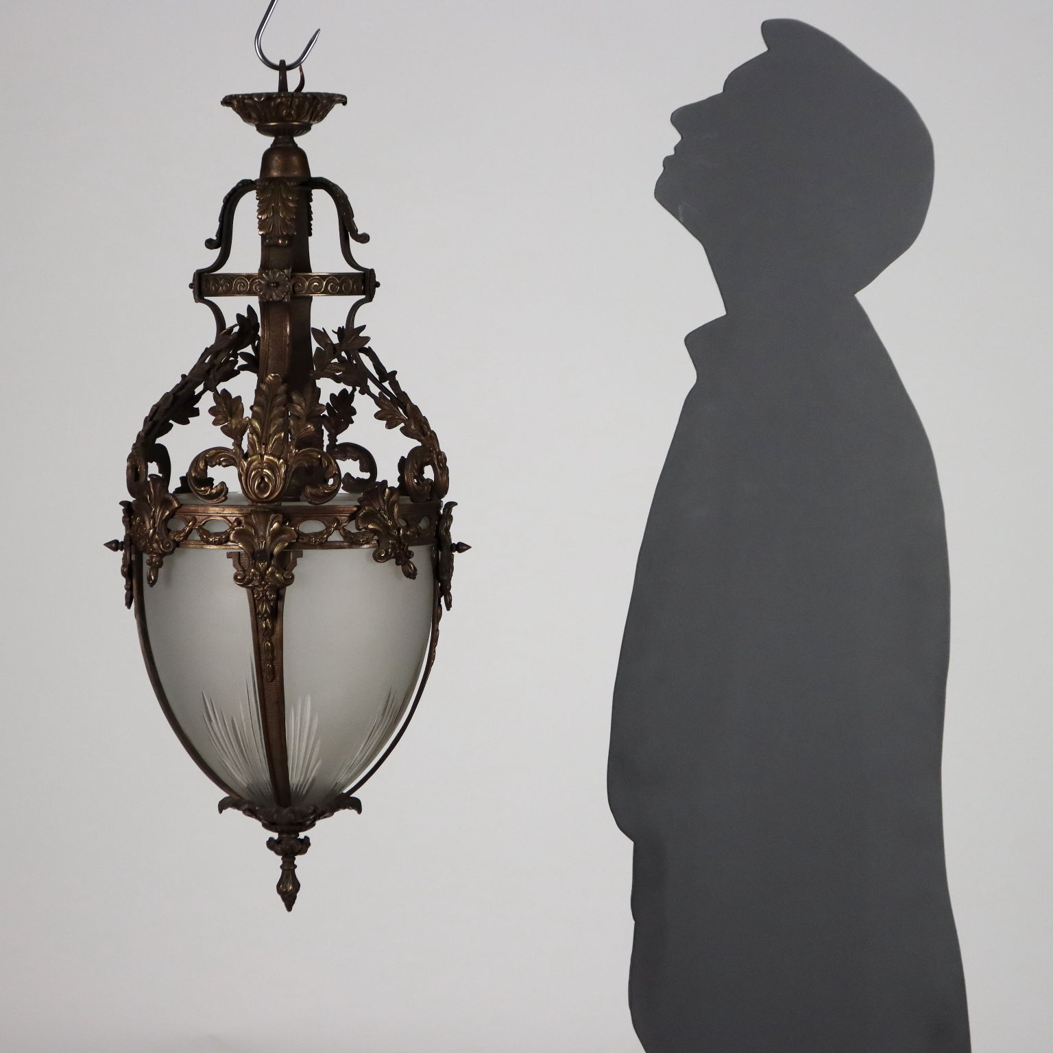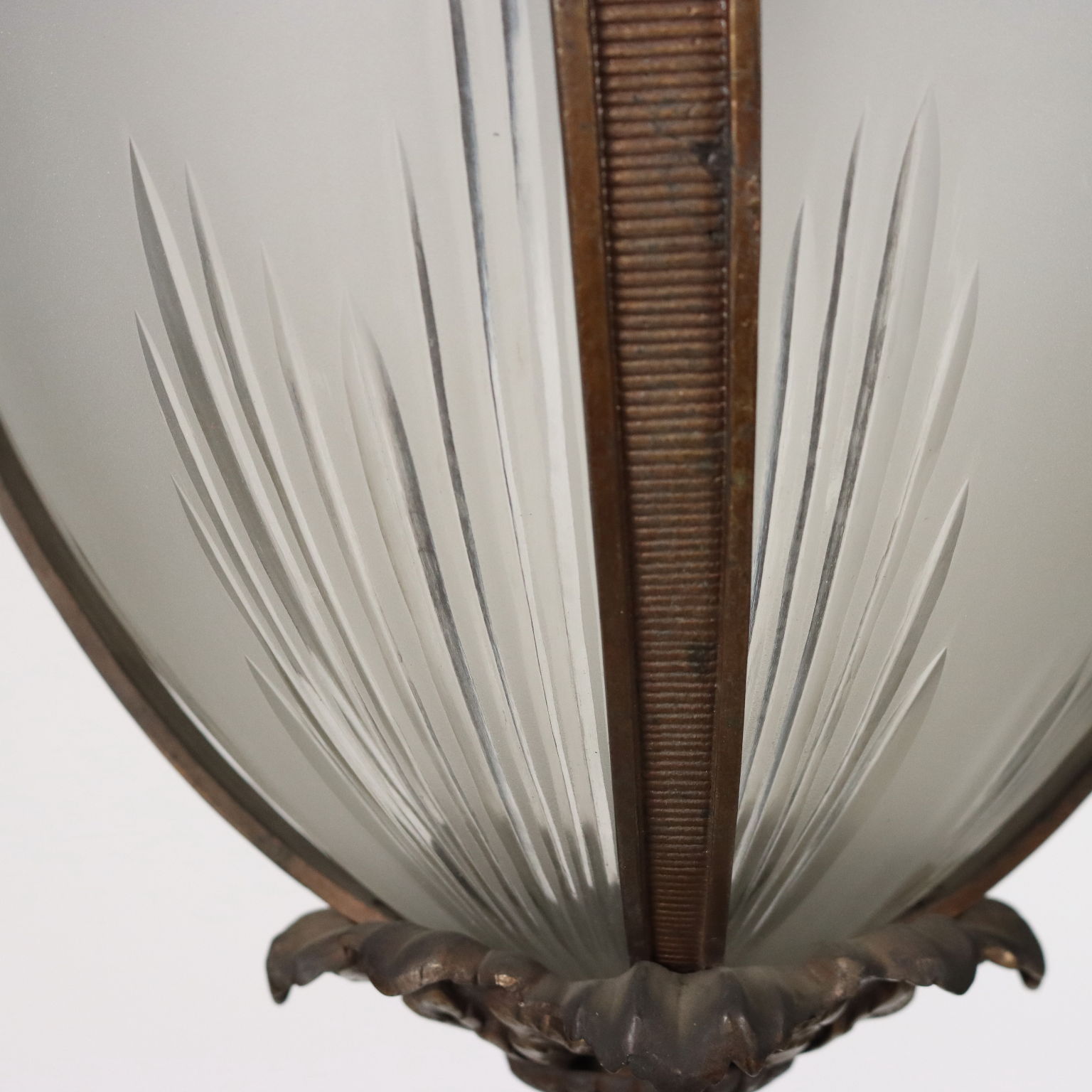 Lanterna in stile liberty con struttura in bronzo cesellato con motivi fogliacei che sostiene una parte in vetro acidato e inciso. Italia inizi XX secolo.