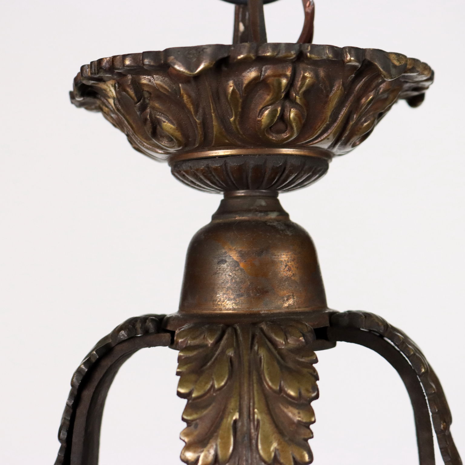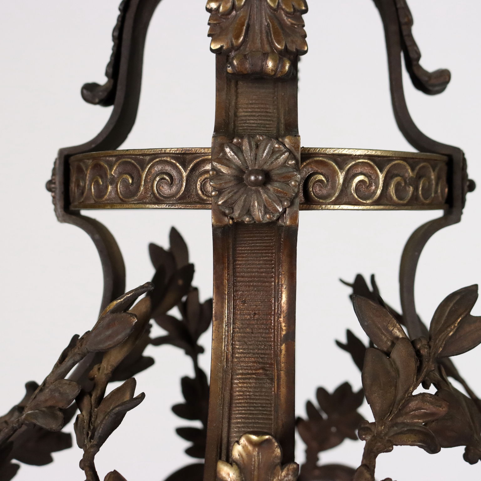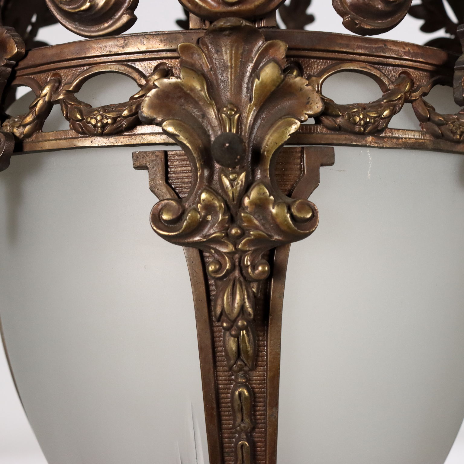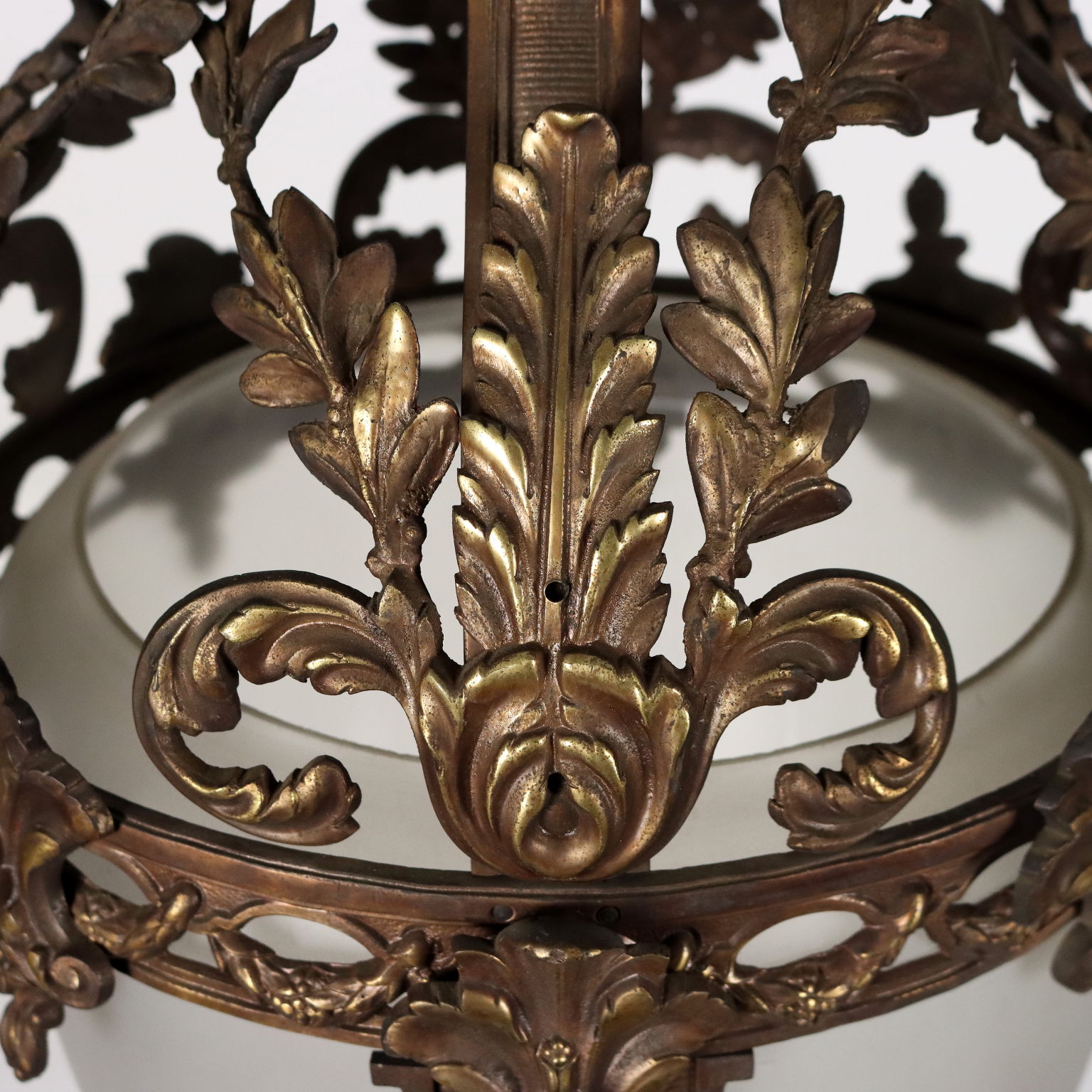 Lanterna in stile liberty con struttura in bronzo cesellato con motivi fogliacei che sostiene una parte in vetro acidato e inciso. Italia inizi XX secolo.