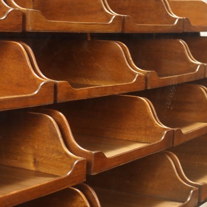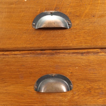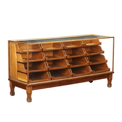 Elegante mobile espositore a cassetti in legno di rovere con metro in ottone sul piano e copertura in vetro.