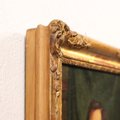 Olio su tela. Espressivo il volto di questo giovane signore, che è ritratto in abiti da casa e in compagnia del cagnolino, in un momento di relax. Il dipinto è presentato in cornice dorata di metà '900.