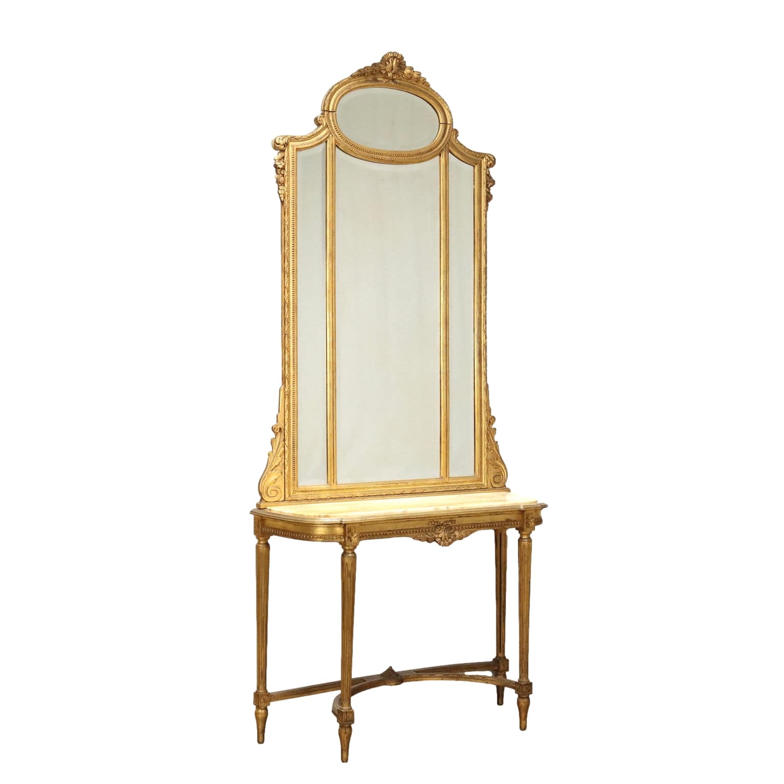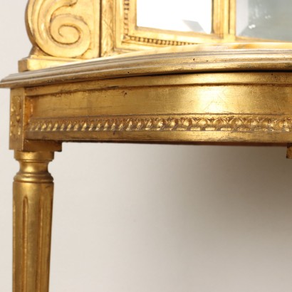 Consolle con alzata in stile neoclassico, specchio bisellato quadripartito da cornici intagliate e dorate sormontate da cimasa recante foglie d'ulivo entro nodo d'amore, elementi floreali ai lati e mensole laterali a ricciolo. Piano in marmo giallo, fascia sottopiano recante motivo continuo e nodo d'amore che ripete l'intaglio della cimasa. Gambe tronco-coniche scanalate e raccordate da traversa semicircolare. Italia XX secolo