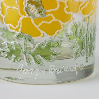 Gruppo di dodici bicchieri in vetro di due diverse misure. Decoro a rilievo raffigurante fiori a petalo giallo. Firma a rilievo dell'autore.